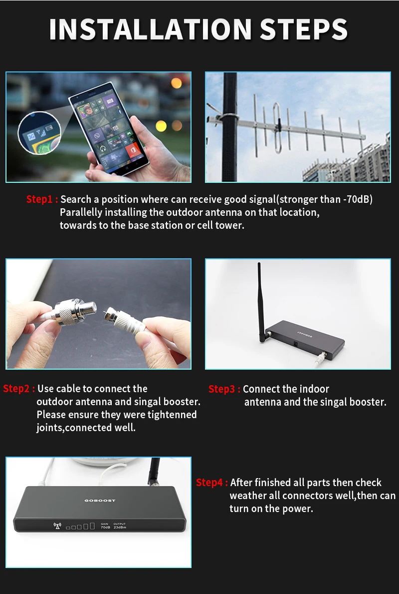 Во-первых:Убедитесь, что вы можете получить как минимум 3 бара сигнала на открытом воздухе (поставить наружную антенну) перед покупкой, в противном случае этот продукт не может вам помочь. Для улучшения сигнала в помещении необходим хороший внешний сигнал.