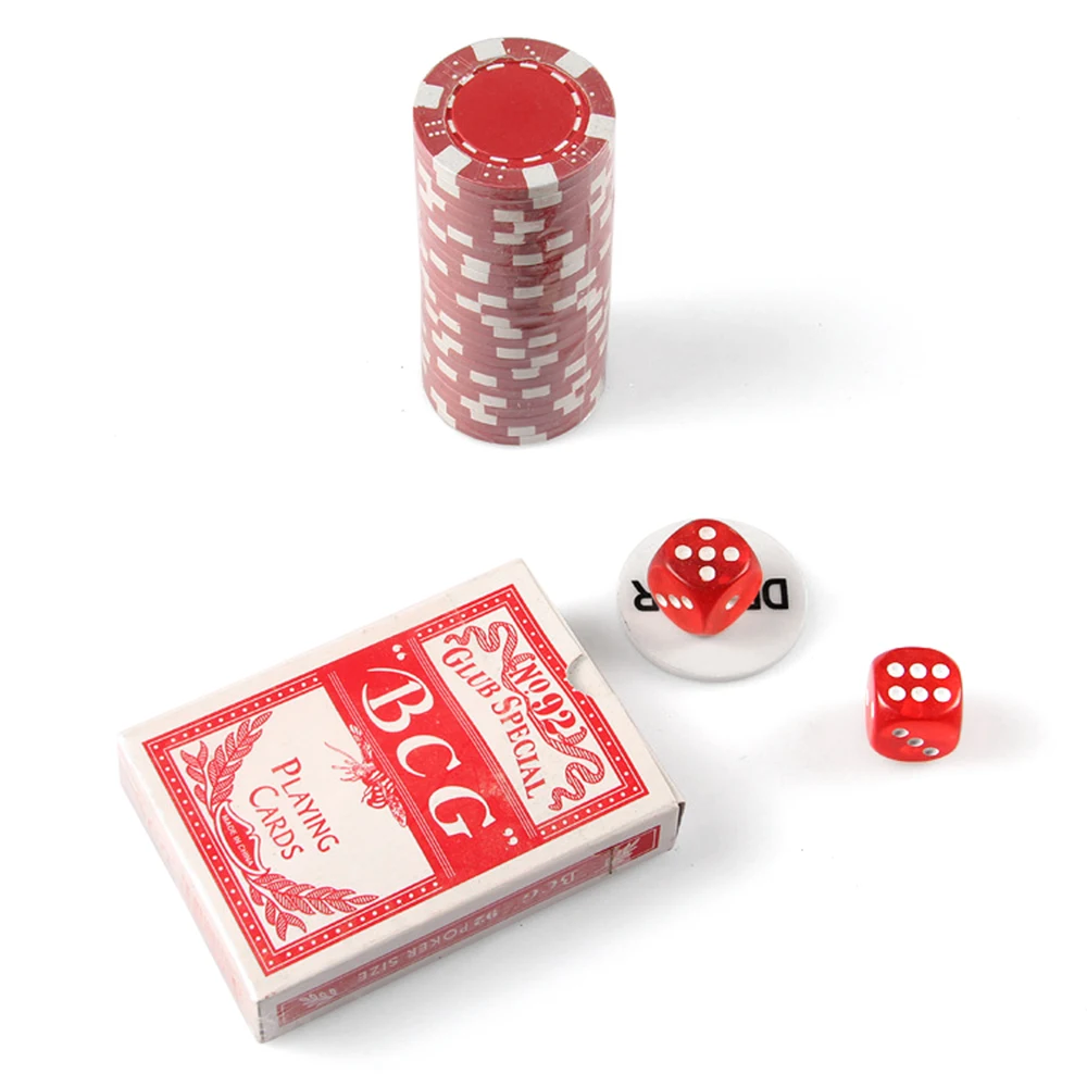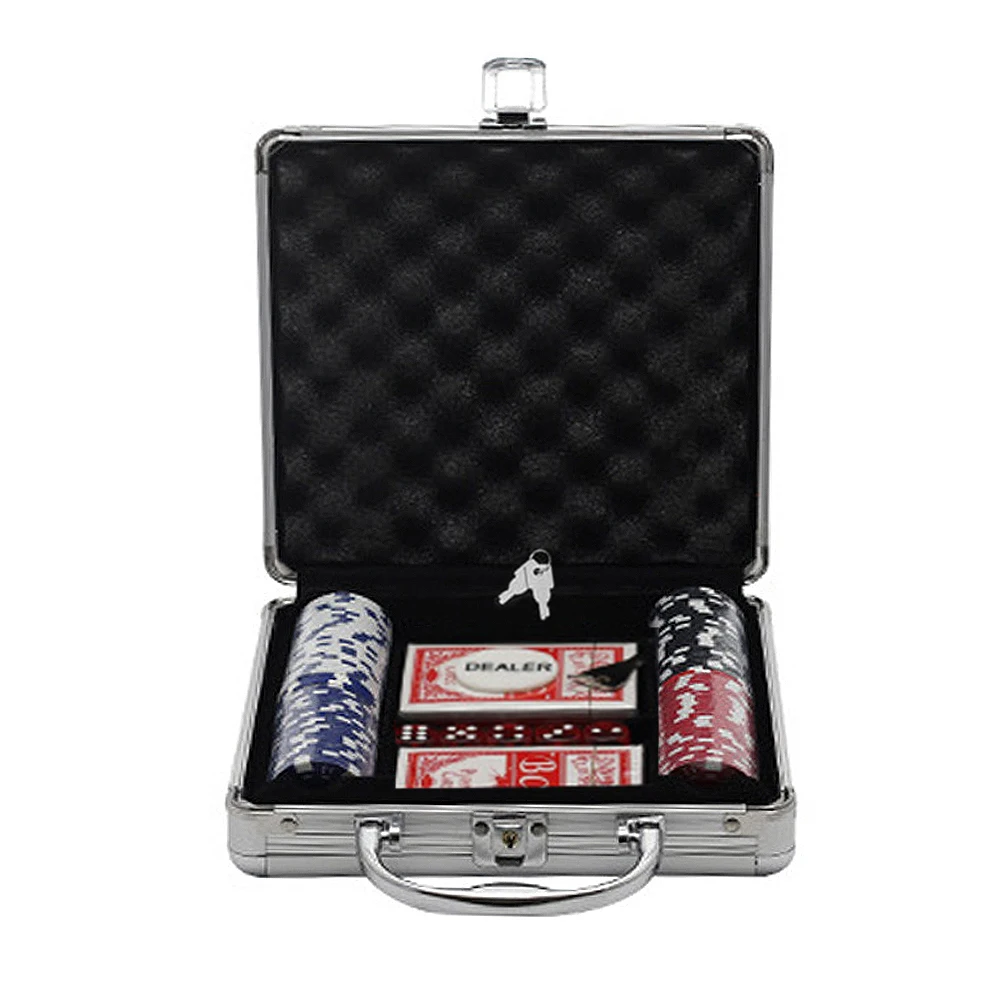 Полностью оснащен 200 фишками для покера, 5 кубиков, 2 колоды карт, 1 Кнопка Дилера и 1 чехол.