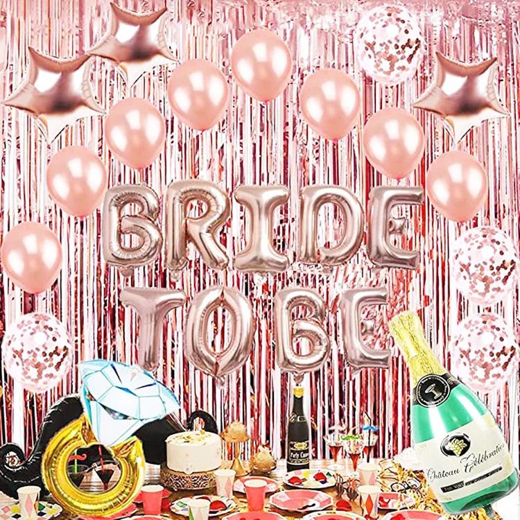 ♥1) 2 шторы для душа из розового золота; ♥2) 1 большой шар в форме бутылки; ♥3) 16 дюймов, с надписью "bride to be" шар; ♥4) 1 воздушный шар с алмазным кольцом; ♥5) три звезды Воздушные шары; ♥6) четыре латексных шара, ♥7) восемь розовые и золотые воздушные шары.