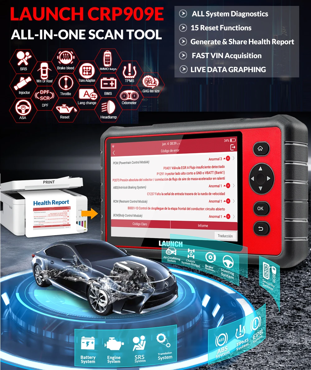 Инструмент диагностического сканирования LAUNCH CRP909E даст вашему автомобилю полное обнаружение, так как он может считывать/очищать DTCs и просматривать данные в реальном времени, а также Сервисные функции для всех систем, например: Двигатели/Авто трансмиссия/подушки безопасности/иммобилайзер/кодирование ключей/ABS/Круиз-контроль/инструменты/самонивелирующиеся системы подвески/сиденья/двери/шлюз/Угол управления/пневматическая подвеска/системы кузова/электронные усилитель рулевого управления и моторная помощь/усилитель рулевого управления/давление в шинах/датчики дождя/4WD система/стабилизатор/Интеллектуальная помощь при парковке/дверные Двигатели/аудиосистемы/кондиционер/Tiptronic/Противоугонная/мягкий верх/Выравнивание фар/Центральный замок/автоматическое сцепление/Сброс ДПФ/электрические окна/программирование плип/Подогрев заднего стекла/Ксеноновые фары/Промывка/нагреватель топлива/распределительная коробка/Память сиденья/масло сброс срока службы/раздвижные двери/Электронная дроссельная заслонка/навигационная система/датчик опрокидывания/Круиз-контроль/многофункциональное рулевое колесо/Aux Отопление/электронный стояночный тормоз/Электроника сцепления,. ... И т. д. (Более 100,0000 автомобилей и механики первый выбор