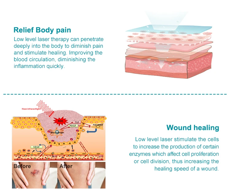 1. Импульсный ручной лазерной терапии используется три различных низкой интенсивности светильник длины волны (650 нм, 808 нм) для облегчения боли и воспаления, связанных со многими острыми и хроническими больными расстройствами. 2. Лечение способствует естественным лечебным и лечебным процессам организма на клеточном уровне. 3. Доказательство 93% эффективно снимает боль 4. Предоставляем безопасные альтернативные препараты, а также хирургические и другие инвазивные способы 5. Легко для потребителей в использовании, удобно и безболезненно 6. Без затрат на медицинское оборудование 7. Поддержка улучшения качества жизни
