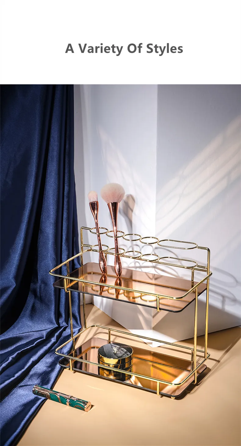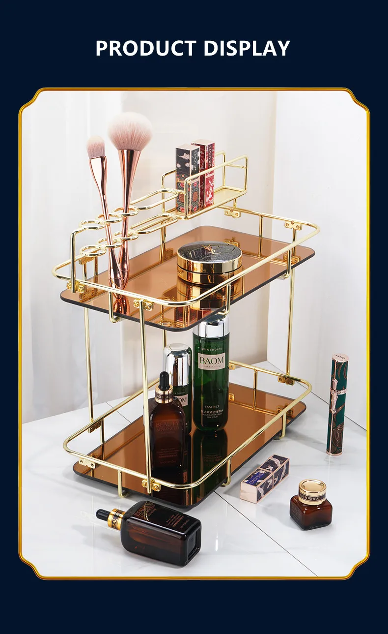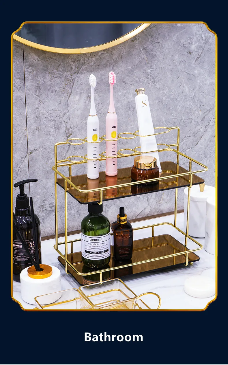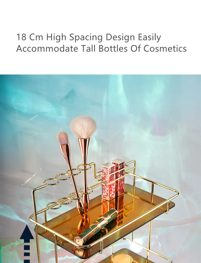 Наши изделия изготовлены из гальванизированного металлического материала, который никогда не заржавеет, поэтому вы можете смело использовать его в ванной комнате. Стильная и роскошная форма делает изделие очень благородным, что способно мгновенно усилить ваше домашнее украшение. Наша полка многофункциональна, ее верхнее круглое отверстие может вместить губную помаду и электрическую зубную щетку, а слой до 18 см, в которой можно легко хранить косметические бутылочки высотой, И хранить ювелирные маски на нижнем слое. Жизнь нуждается в красивых вещах для украшения, так что ваш