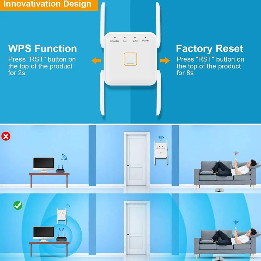 360 ° полный охват: Этот Wi-Fi 5 ГГц и 2,4 GHz Dual Band Wi-Fi расширитель диапазона Работает с любым устройством, стандарт Wi-Fi маршрутизатор 360 градусов высокоскоростным соединением для счастливый серфинг hd-видео и онлайн-игры