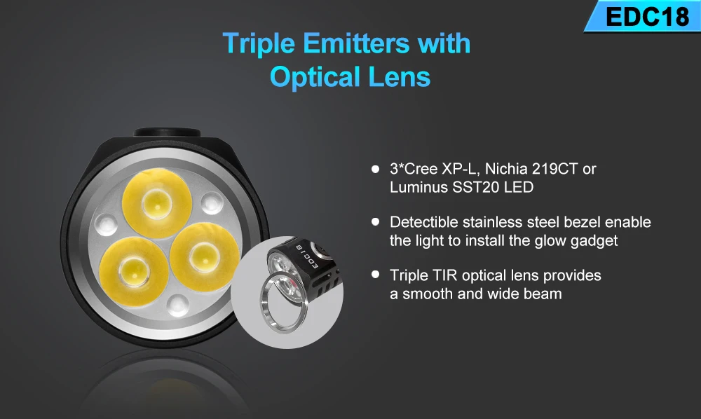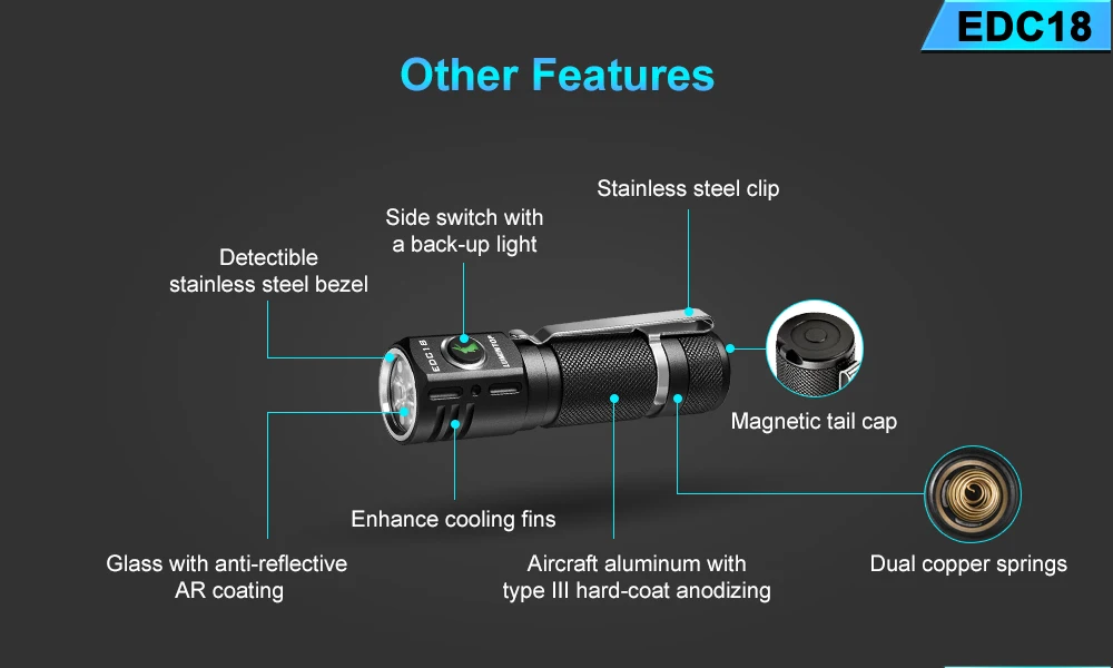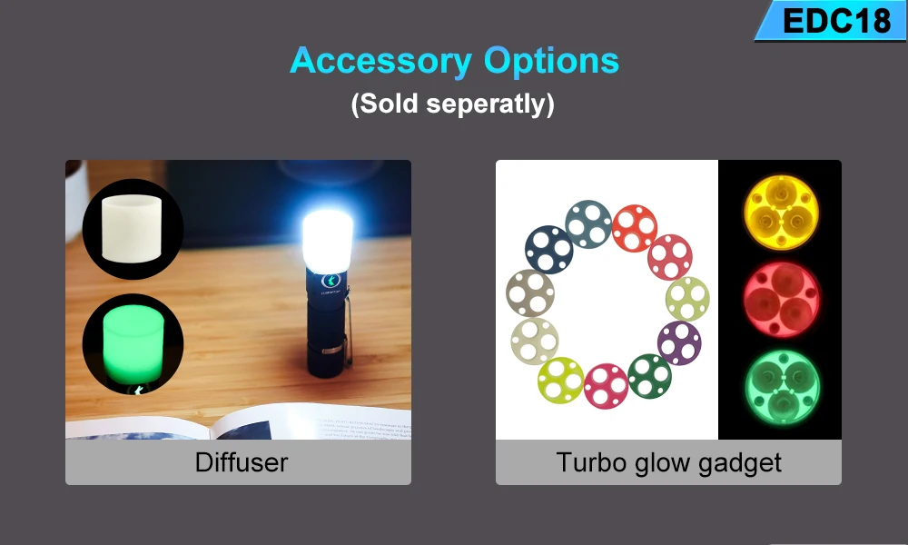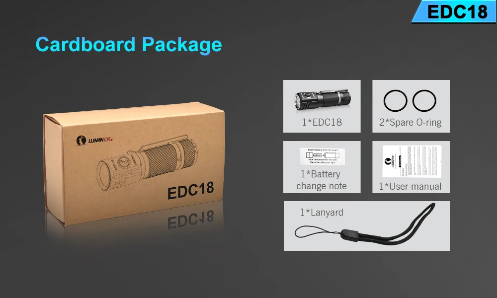 Посылка включает в себя: EDC18 фонарик * 1, запасное уплотнительное кольцо * 2, изменение батареи Примечание * 1, руководство пользователя * 1, ремешок * 1