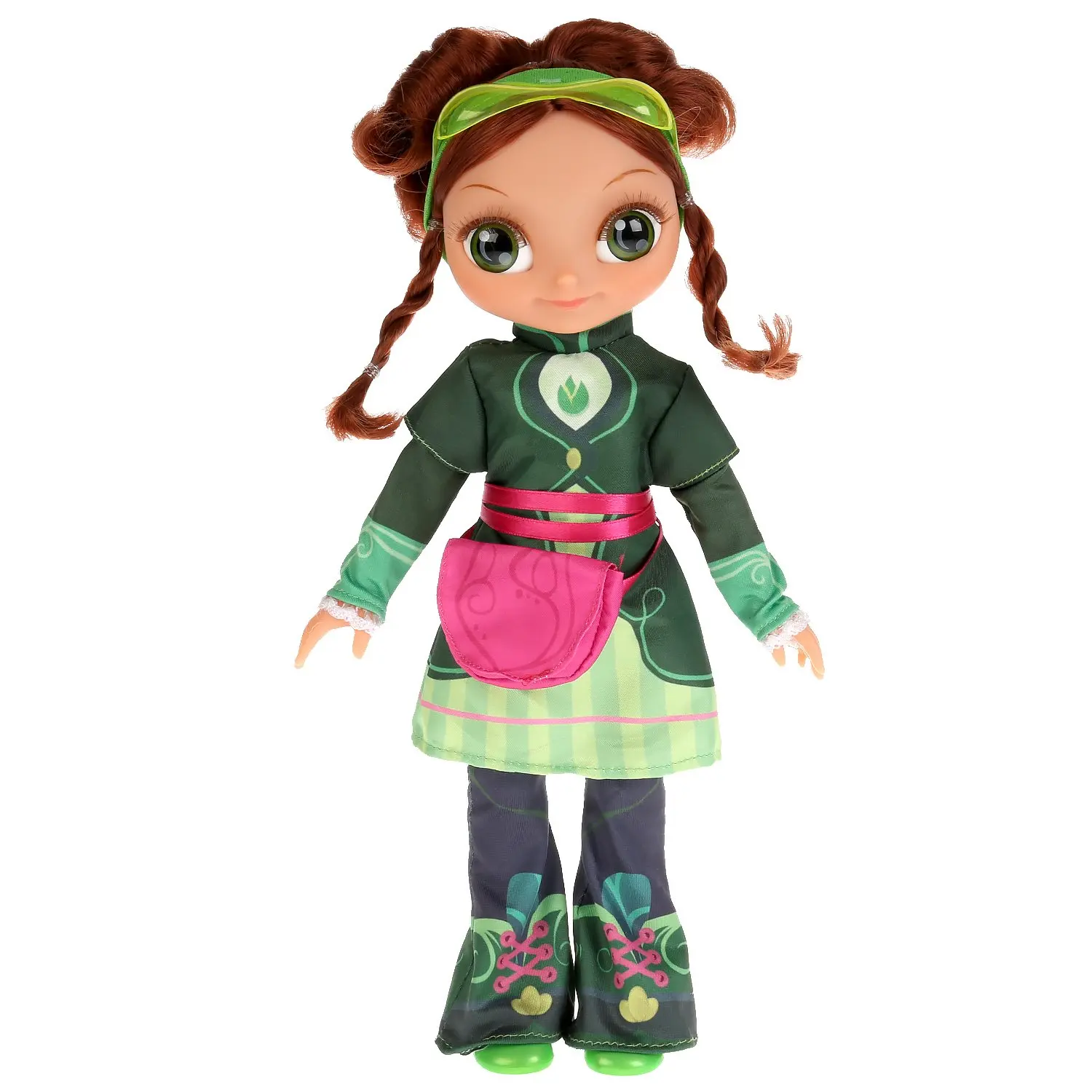 Маша одета в яркий зеленый костюм и туфельки (легко снять и надеть). Мягкие