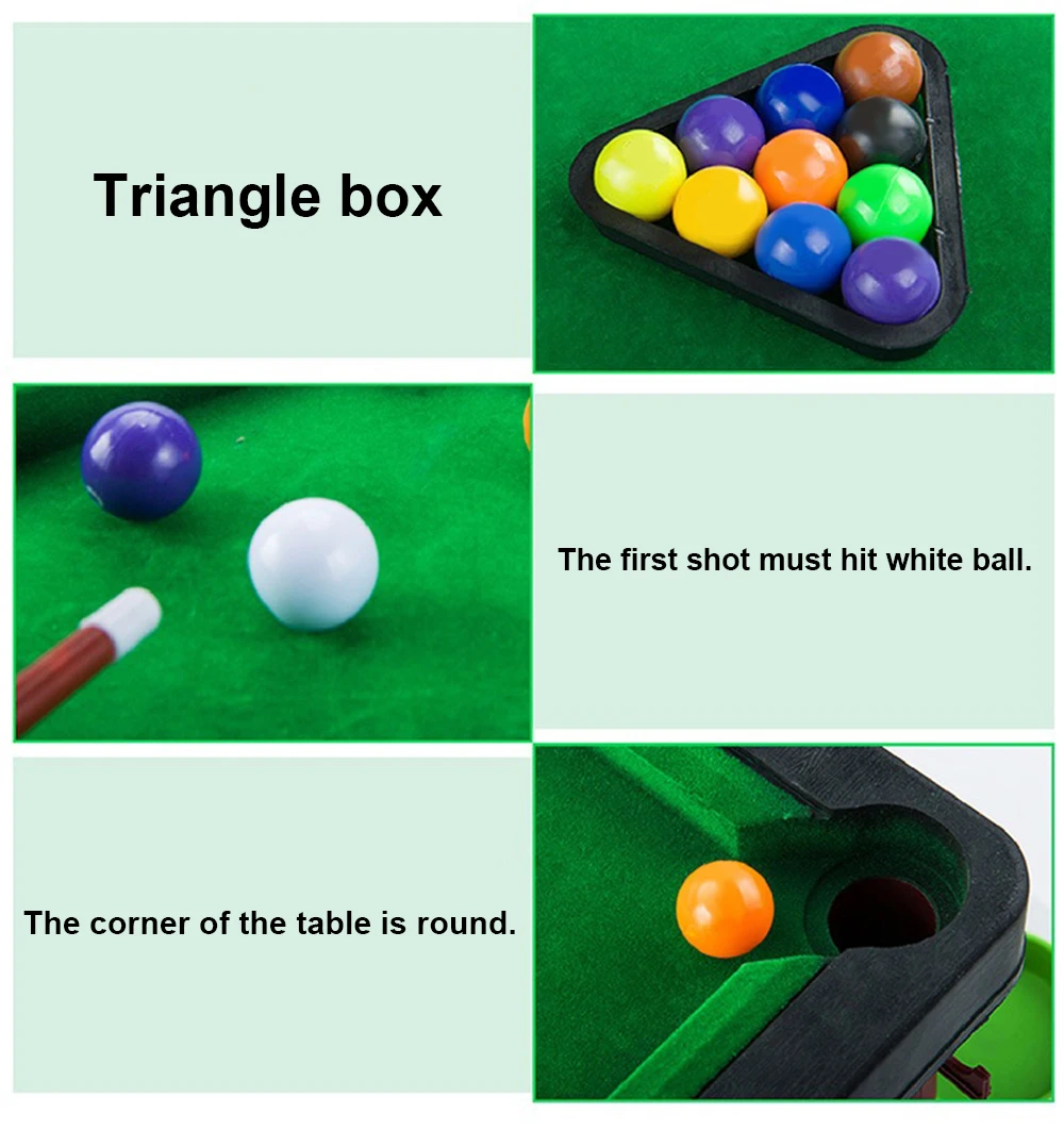 -Треугольная коробка используется для размещения шаров в треугольнике. -Первый снимок должен удариться о белый шар. -Угол стола круглый, что предотвращает повреждение детей.