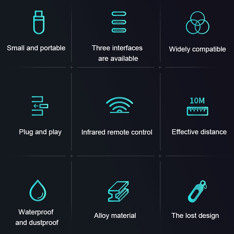 2. [Производительность] маленький и тонкий объем составляет всего 3,1*1,15*0,6 см, что удобно носить с собой. Благодаря инфракрасному пульту дистанционного управления эффективное расстояние составляет до 10 м, а дистанционное управление достигается. Водонепроницаемый и пыленепроницаемый, имеет защиту от потери (Подарочная защита от потери). Три интерфейса являются дополнительными, широко совместимы с различными телефонами, plug-and-play. Прочный материал изготовлен из сплава.