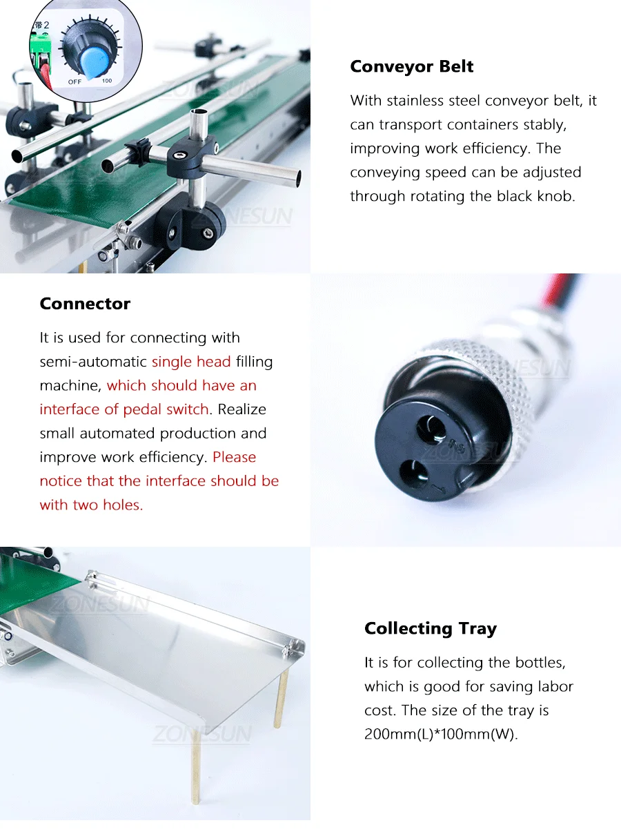 2. Полуавтоматическая фасовочная машина должна быть сПорт переключения педалей, Так что он может быть соединен с этой конвейерной лентой.