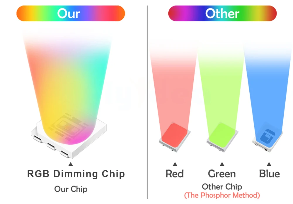 RGB+ Cool white + Warm white and the brightness of every color is dimmable. The light brightness can be fixed percentages from 1% - 100% output. Setting your desired colors and brightness to create different ambience for party, dating, relaxing and other occasions via phone App. No Flashing.