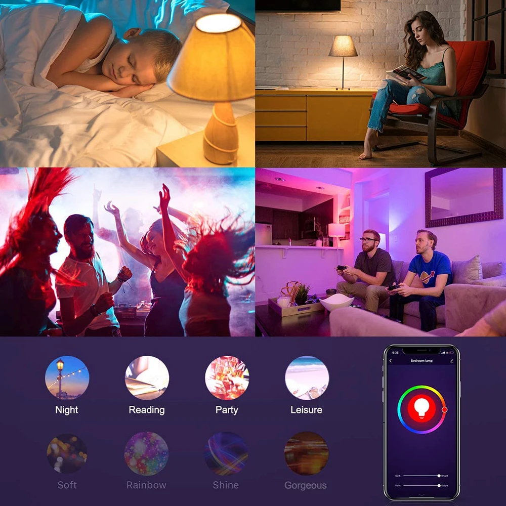 Manage your smart bulbs via phone App. You can check the power status of each light bulb and control the bulbs anywhere (Dim,turn on or off or change the colors of your bulb remotely). no need to worry about leaving home and forgetting to turn off the lights. Also enable to randomly switch on and off to trick potential intruders. No hub required and easy to install.