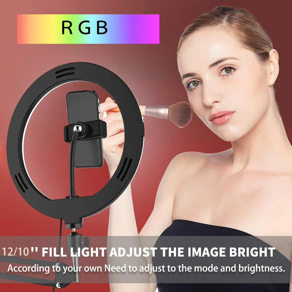 Selfie Ring Light RGB With Desk Long Arm Tablet Tripod Phone Holder Stand Fill LED RingLight Phone Photography Rim Light Live Video Shooting Makeup Circle Lamp