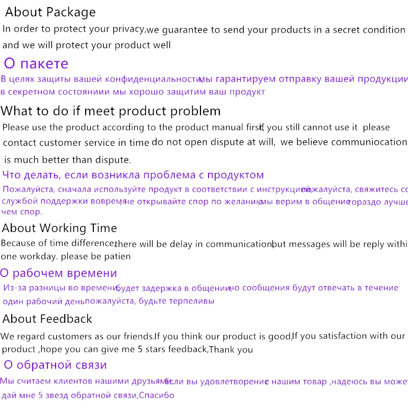 1. Чтобы защитить вашу конфиденциальность, мы обещаем отправить ваши товары в секретном состоянии, без каких-либо изображений и слов о сексе 2. Если у вас есть какие-либо вопросы о нашей продукции, пожалуйста, свяжитесь с нами. Мы сделаем все возможное, чтобы удовлетворить все ваши потребности 3. Если у товара есть проблемы с качеством, пожалуйста, обработайте в течение 7 дней с момента получения (уведомление о фотографии товара в службу поддержки клиентов), вам необходимо вернуть или обменять возврат груза, мы оплачиваем стоимость доставки. Если тестирование продукта без каких-либо проблем с качеством, вам необходимо оплатить доставку туда и обратно.