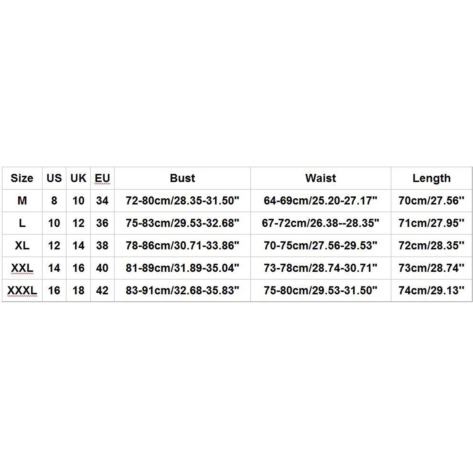 Размеры США Великобритания ЕС Бюст Талия Длина М 8 10 34 72-80 см/28,35-31,50" 64-69 см/25,20-27,17" 70 см/27,56'' L 10 12 36 75-83 см/29,53-32,68" 67-72 см/26,38-28,35" 71 см/27,95'' XL 12 14 38 78-86 см/30,71-33,86" 70-75 см/27,56-29,53" 72 см/28,35'' XXL 14 16 40 81-89 см/31,89-35,04" 73-78 см/28,74-30,71" 73 см/28,74'' XХХL 16 18 42 83-91 см/32,68-35,83" 75-80 см/29,53-31,50" 74 см/29,13''