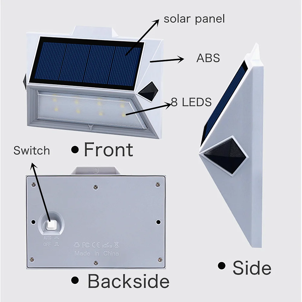 Спецификация: -Тип изделия: 8 светодиодный настенный светильник на солнечных батареях -- Материал: АБС-пластик + Поликарбонат -Светодиодный: 8 шт. -- Аккумуляторы Тип: 1,2 V /1000mAh -- Водонепроницаемый: IP65 -Светодиодный Цвет: белый -- Гарантия: 1 год Посылка включает: 2/4 шт. x светодиодный светильник на солнечной батарее