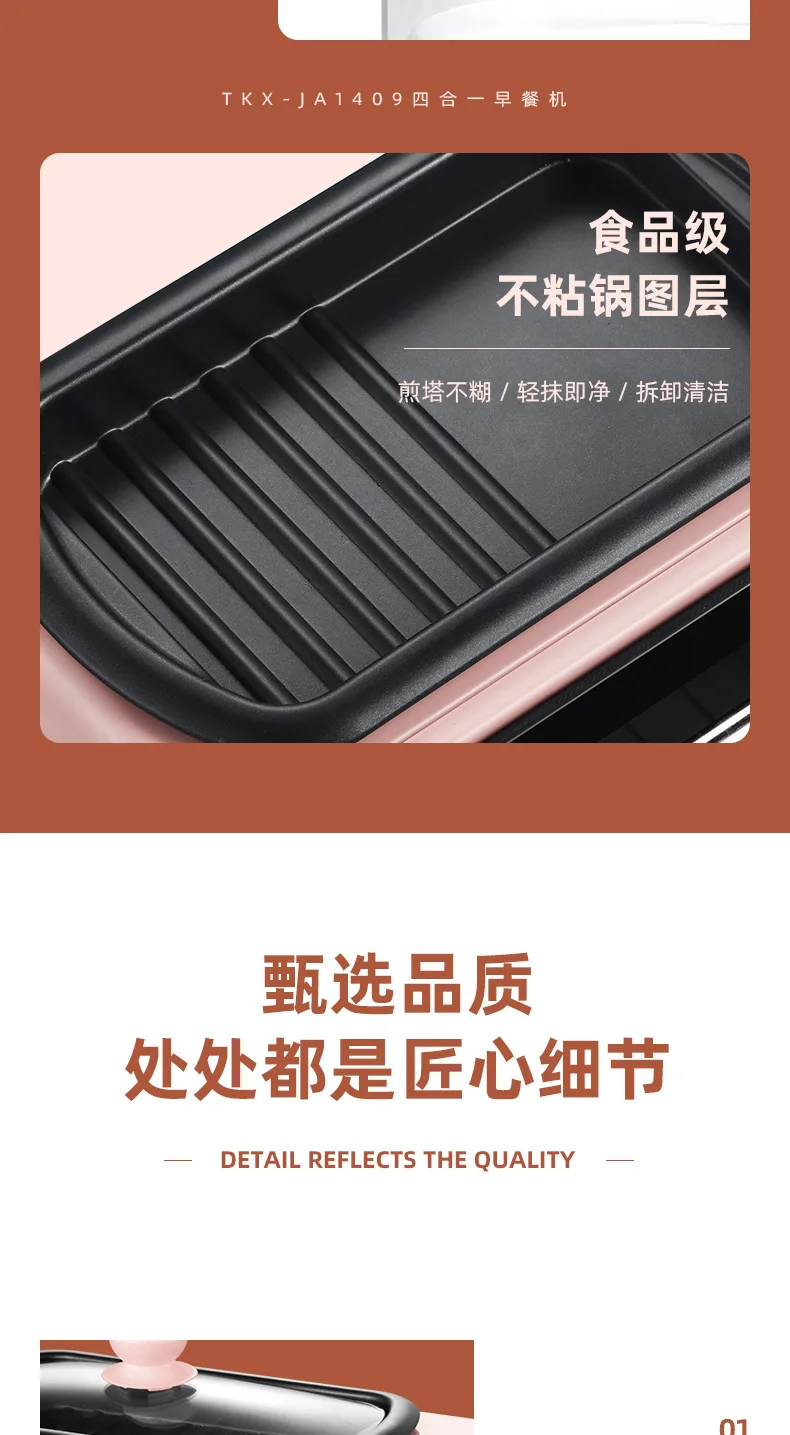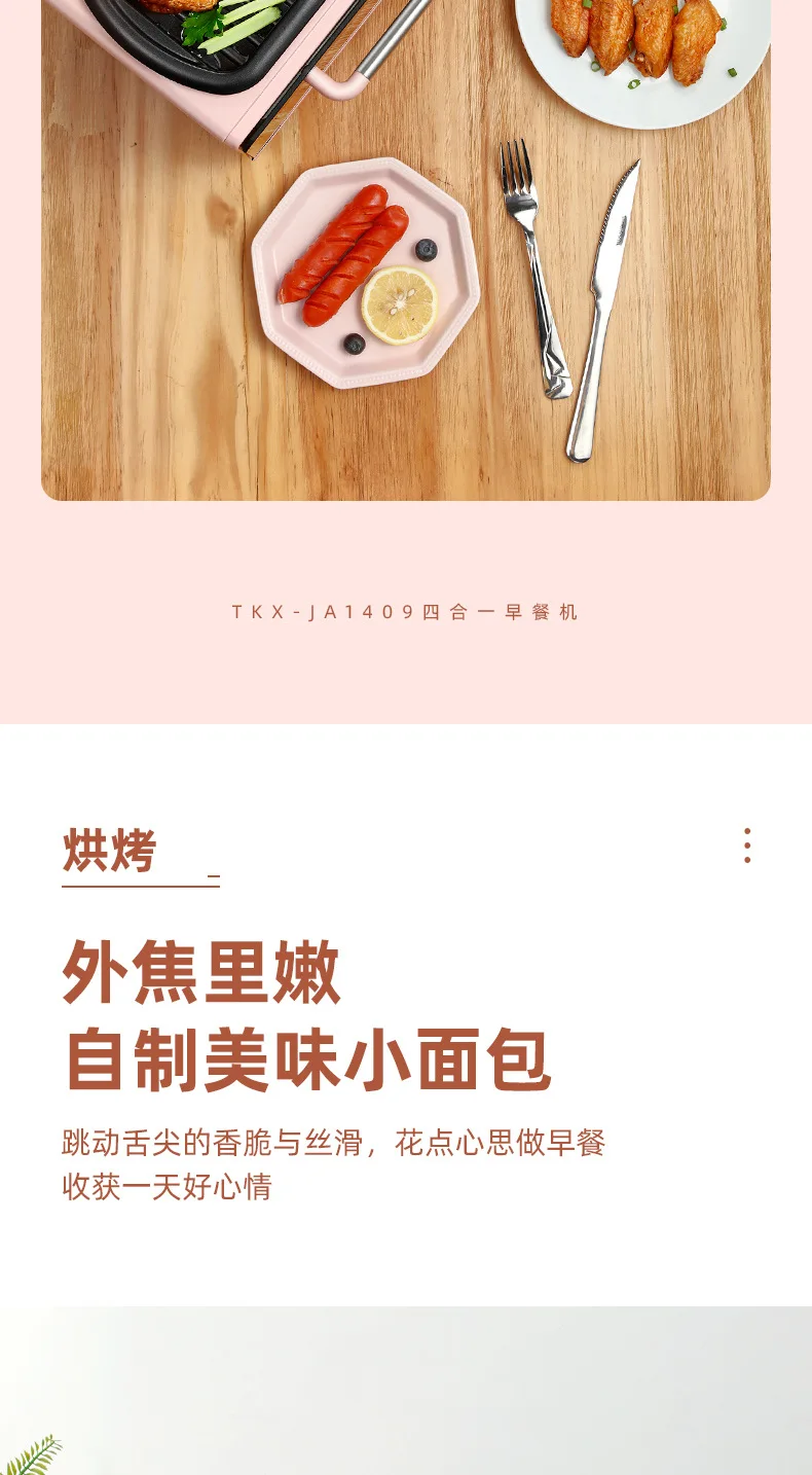 Название: многофункциональная машина для завтрака Модель изделия: TKX-JA1409 Номинальное напряжение: 220 В ~ 50 Гц Номинальная мощность: 1050 Вт Объем продукта: 7 л Вес изделия: 2,98 кг Размер изделия: 289*266*237 мм