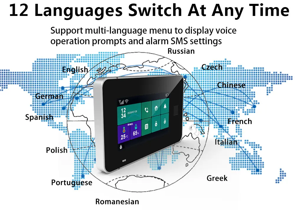 Wifi + GSM двойная сетевая сигнализация 1. Сигнализация с одной клавишей 2. Сигнализация 3. Управление приложением Tuya 4. Отображение температуры и влажности 5. Подсказка низкого напряжения 6. Мобильный телефон 7. Wi-Fi 8. Напоминание о звонке 9. Приложение SMS push 10,12 языков переключатель