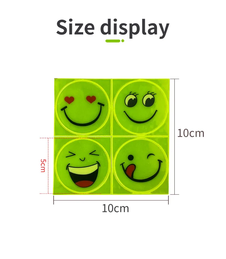Один лист: 10x10 см Один шт. Размер лица для улыбки: 5 см в диаметре. Посылка: в одном листе 4 смайлика. Материал: отражающий ПВХ