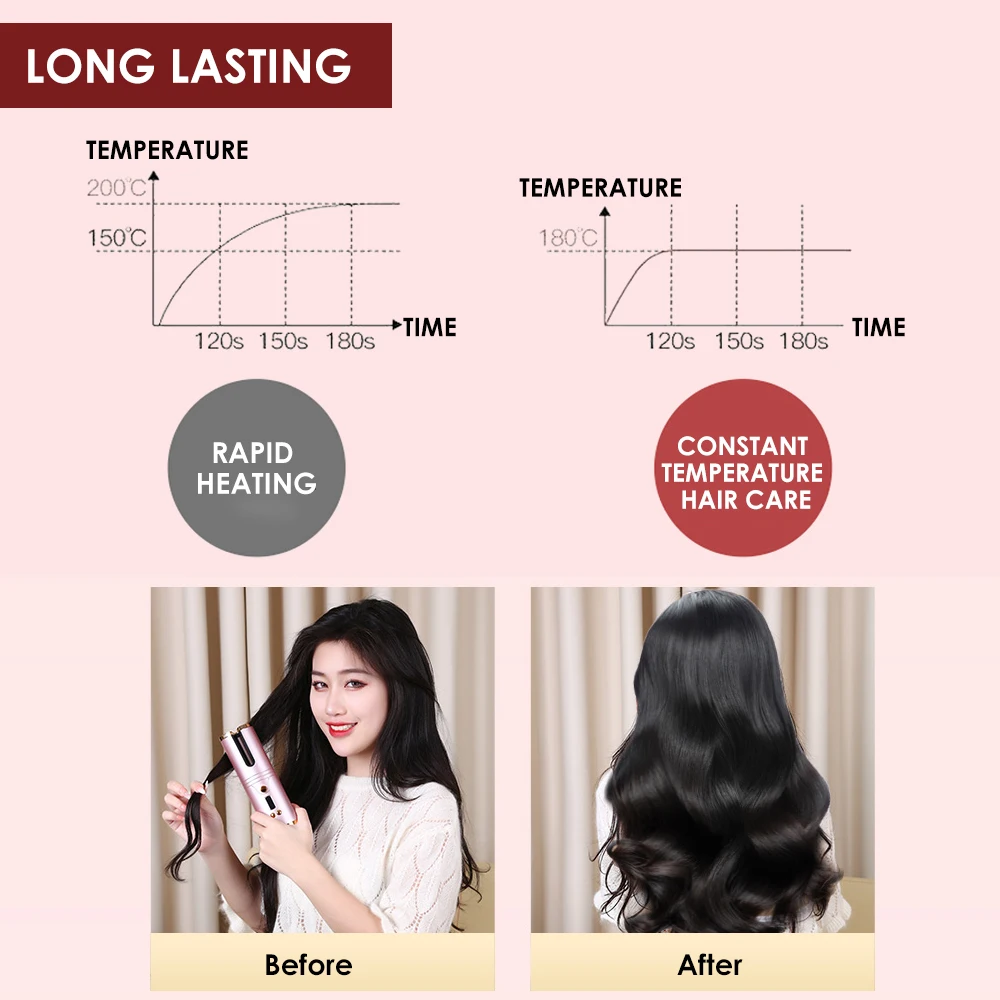 Керамические нагревательные пластины PTC наполнены антистатическим турмалином, могут равномерно распределять тепло по поверхности ствола, чтобы избежать ненужного теплового повреждения и уменьшить завивка волос и статику, приводя к блеску, вместо более здоровых и крепких волос.