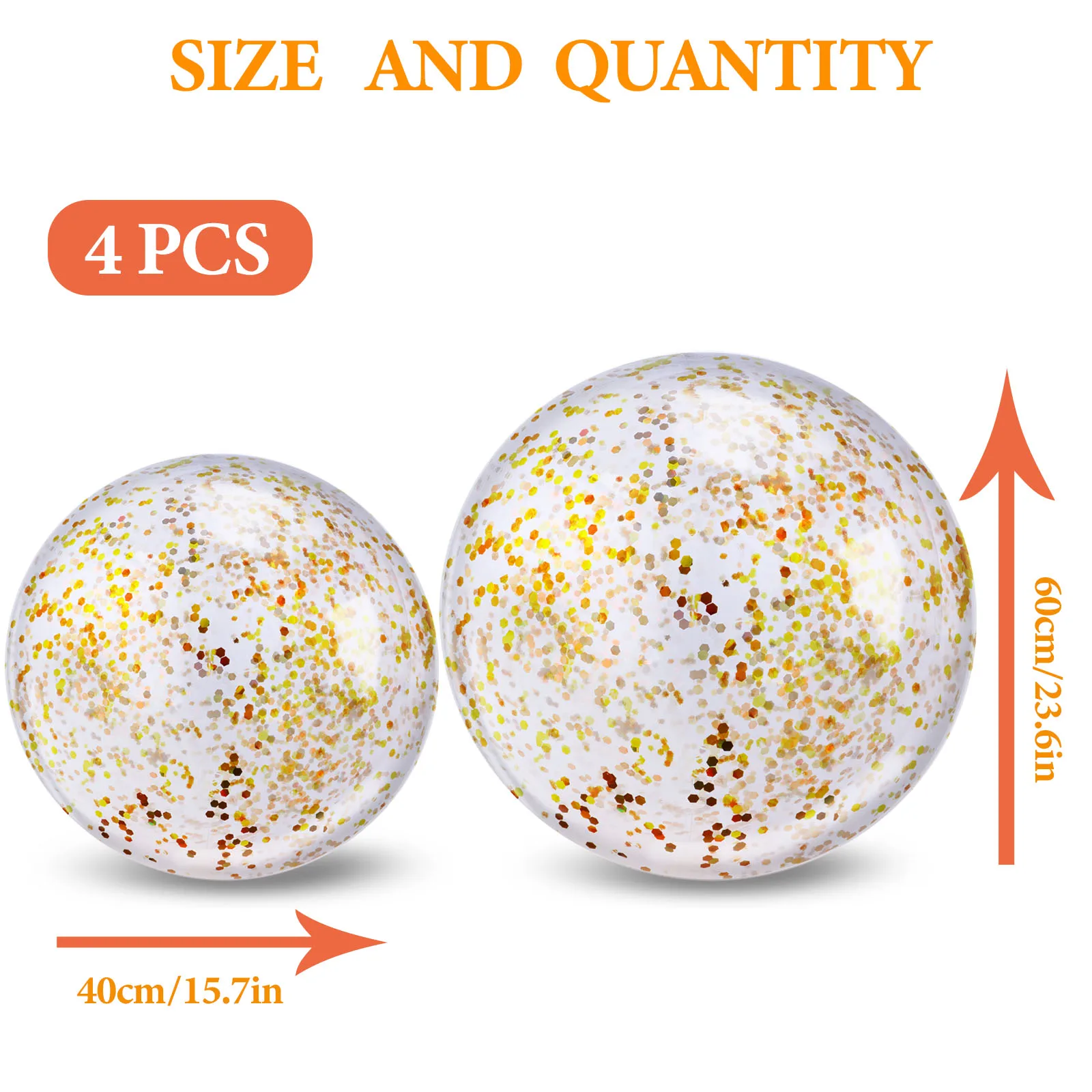 Посылка-есть 4 шт. пляжных шариков с пайетками в 2 разных размерах и 2 разных цвета, золотых шариков с блестками диаметром 24 дюйма, цветных шариков с блестками 24 дюйма, золотые блестки 16 дюймов и красочные блестки 16 дюймов, достаточное количество для людей, чтобы удовлетворить потребности.