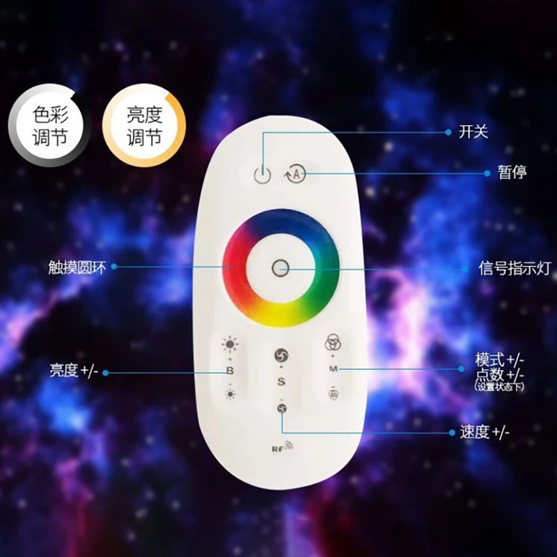 1. Пульт дистанционного управления принимает нажатие 433 радиочастоты, имеет функции регулировки яркости и цвета и может реализовывать воспроизведение в режиме динамического режима.