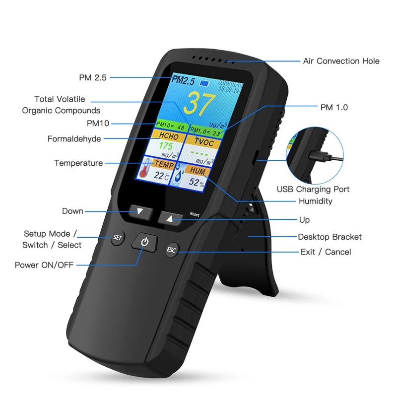 [9 в 1 Многофункциональный монитор качества воздуха] Новый Улучшенный внутренний монитор качества воздуха, который может точно оценить различные измерения качества воздуха, включая концентрацию формальдегида (HCHO), PM2.5, PM1.0, PM10, HCHO, TVOC, температура, влажность, AQI, дата/время. Это очень необходимо для вас, чтобы узнать качество воздуха вашего места проживания