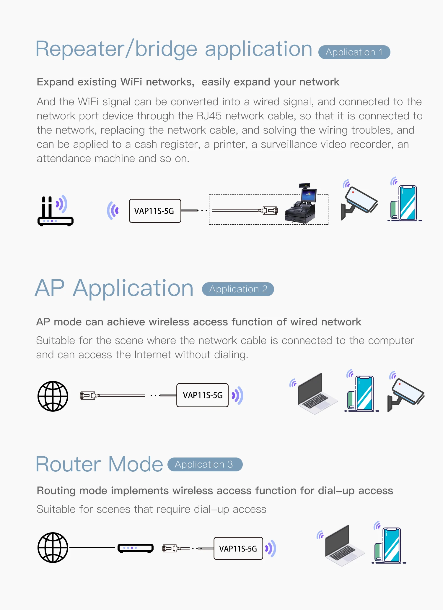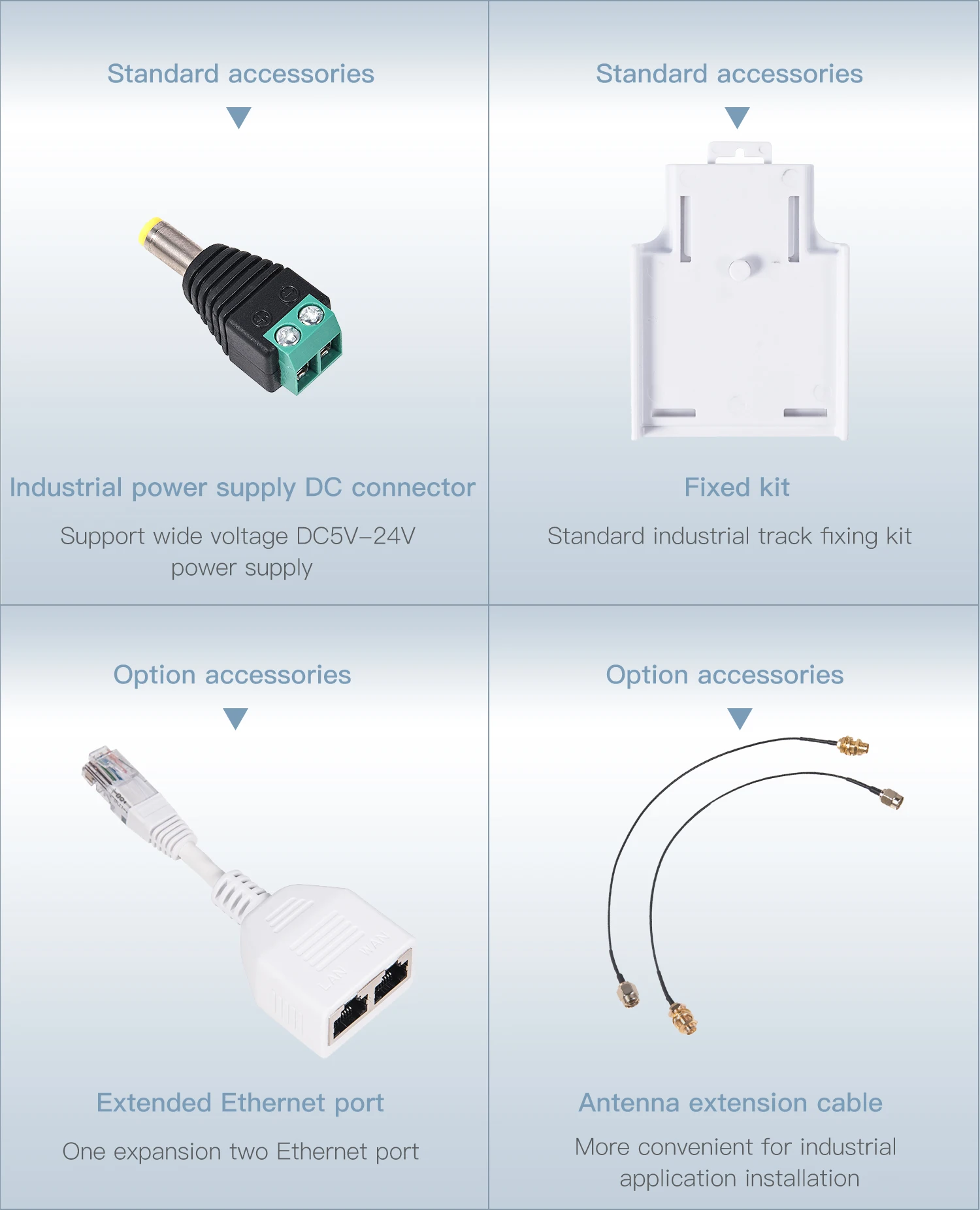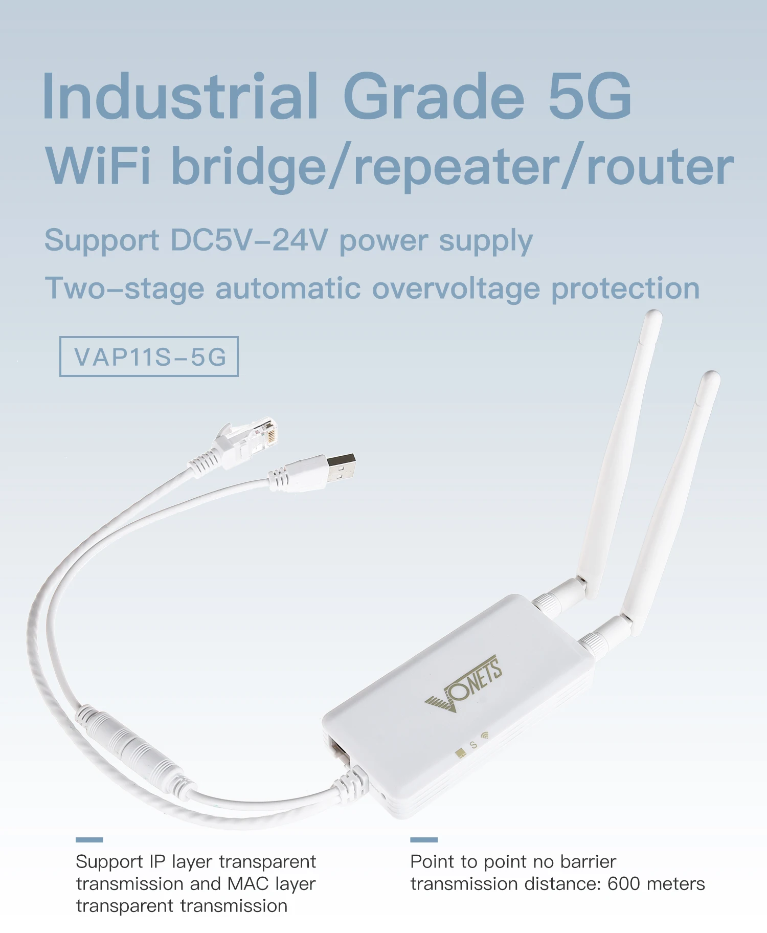 1. Промышленный 5G Wi-Fi мост/ретранслятор/маршрутизатор; 2. Поддержка широкого напряжения DC5-24V источника питания, Двухуровневая автоматическая защита от перенапряжения, 27 в точка защиты от перенапряжения; 3. Поддержка 802.11AC, 802.11A, 802.11N и других протоколов передачи WiFi; 4. Скорость беспроводной передачи данных: 900 Мбит/с; 5. Мощность передачи: 19 дБм/23 дБм опционально; 6. Безбарьерная максимальная дальность передачи: 200 метров; 7. Две внешние антенны 4dBi могут быть расширены удлинительным кабелем (опционально); 8. Два 10/100 Мбит/с Ethernet адаптивная портов, а также вариант с возможностью расширения Ethernet порт (один расширения и два) предоставляется помощь; 9. Wi-Fi точка доступа, Максимальная память 100 точек доступа; 10. Поддержка одновременного подключения более 20 устройств WiFi;