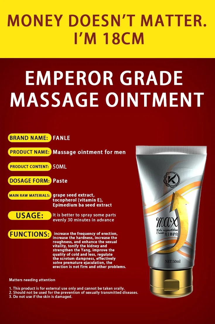 Product name: Massage ointment for men Product content :50ml Usage: Evenly apply appropriate amount to the local area during use Function: increase the frequency of erection, increase the hardness and increase the crude prevention of premature ejaculation, and enhance sexual vitality, tonify the kidney and strengthen Yang, improve the management of scrotal moisture, effectively relieve premature ejaculation, erectile time is not long and other problems Note: This product cannot be taken orally and cannot be used if the skin is damaged