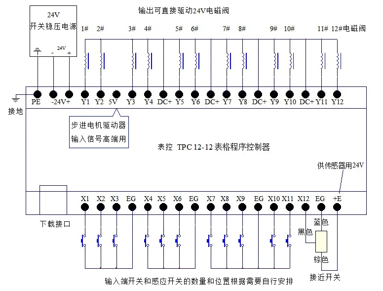 Выходная проводка: Соленоидный клапан цилиндра может быть непосредственно подключен к выходу контроллера, выберите любое положение. Если ток и напряжение слишком высоки, следует использовать реле, посылка кабеля напрямую подключается к любому выходному терминалу управления счетчиком, контакты соединены в серии в цепи питания нагрузки.
