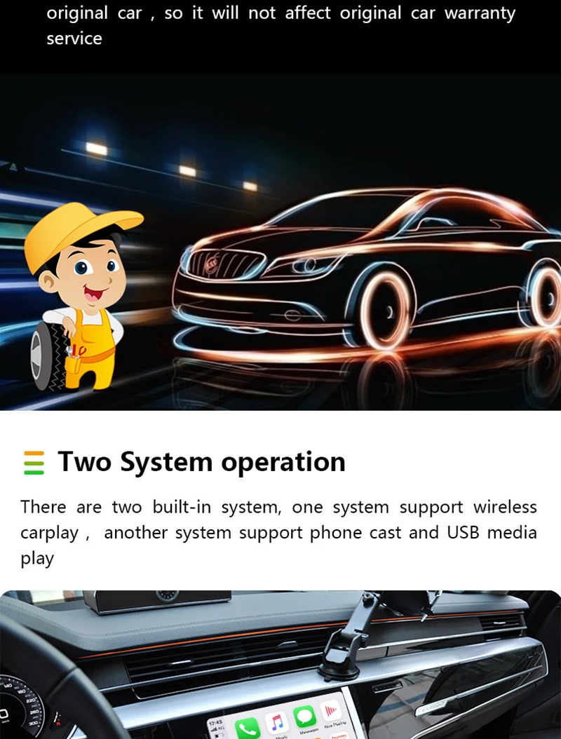 7. Поддержка функции беспроводной CarPlay. Нажмите на носитель под оригинальной беспроводной системой CarPlay, чтобы перейти ко второй системе. Две системы можно переключать свободно (2 минуты ожидания, не волнуйтесь)