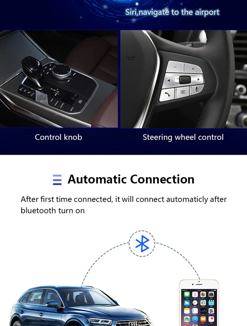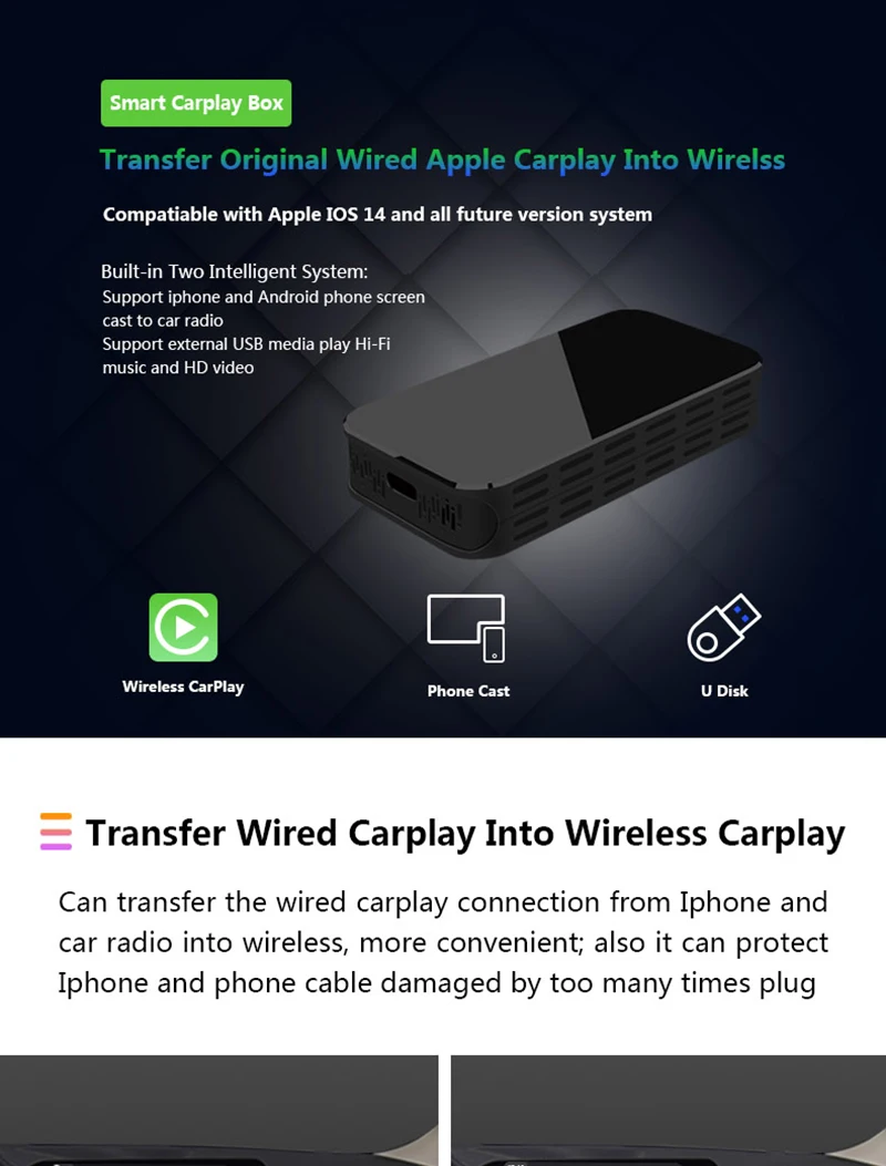 3. Беспроводная carplay подключается на мобильный телефон, а оригинальная автомобильная система напрямую подключается к оригинальному автомобилю через USB. Сохраните оригинальное качество звука автомобиля, Поддерживайте Оригинальное касание автомобиля, управление ручкой, Siri voice, после подключения один раз, он будет автоматически подключаться каждый раз, сохранение проблем с подключением к проводному карлику каждый раз, а частое подключение и подключение к iPhone приведет к повреждению разъема телефона);