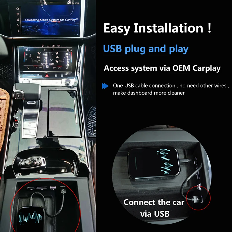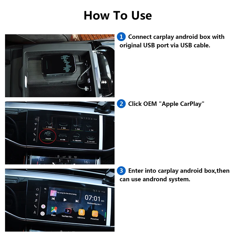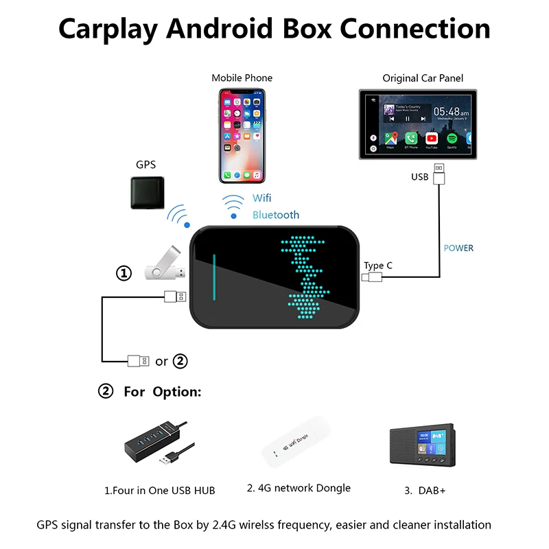 Комплектация:1 * Carplay Беспроводная коробка, 1 * Руководство пользователя, 1 * Подарочная коробка, 1 * GPS антенна, 1 * GPS плесень кабель питания, 1 * USB кабель.
