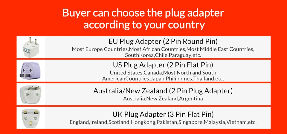 1. Мы принимаем дропшиппинг заказы и оптовые заказы. Больший заказ, большая скидка. Пожалуйста, свяжитесь с нами для получения дополнительной информации. 2. Важно! Цена заказа в нашем магазине содержит только цену продукта и стоимость доставки, которая не содержит каких-либо таможенных пошлин. Если вы выбираете доставку экспресс-почтой, цена не включает плату за удаленную зону или дополнительные расходы по доставке, вызванные причиной покупателя. Обратите внимание, что покупатели несут ответственность за все дополнительные сборы за импорт в вашу страну. Мы не возмещаем стоимость доставки за отказ от доставки. 3. Большинство наших продуктов-китайская версия. Покупатели могут выбрать правильный адаптер в соответствии с вашей страной. Обратите внимание, что ваш выбор вилки-это выбор адаптера. Фотографии адаптеров для справки: