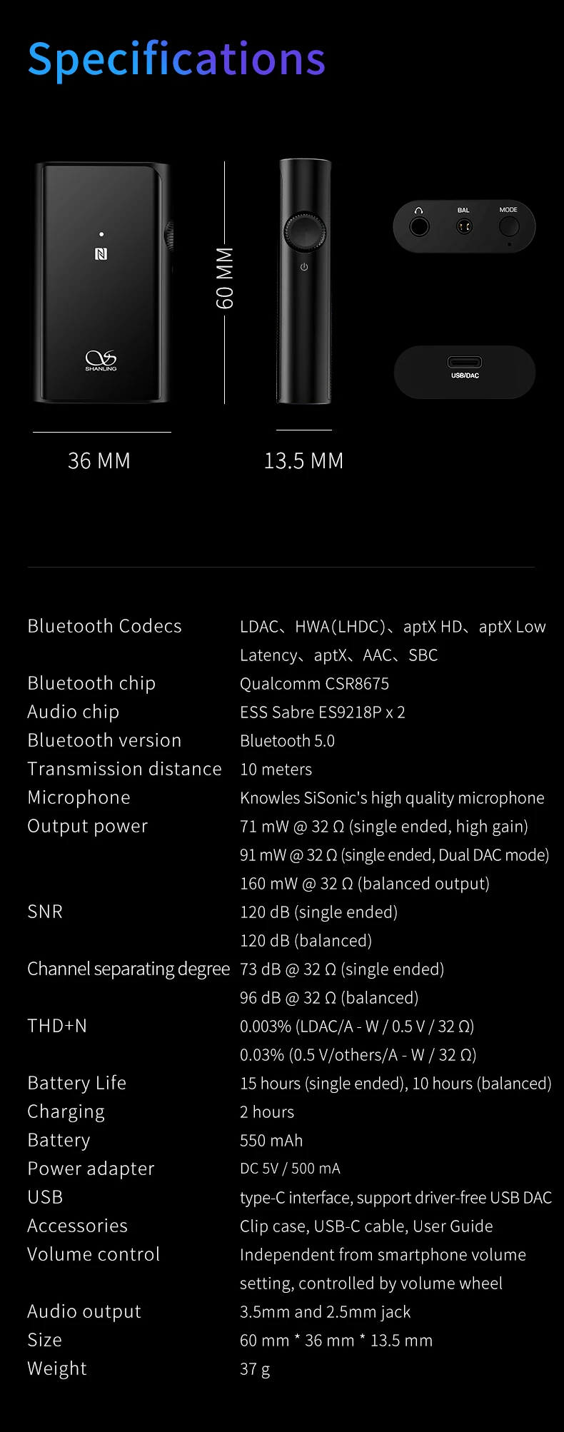 Shanling UP4 featured World's latest Bluetooth wireless DAC/amplifiers, support all current wireless audio codecs – such as AAC, SBC, aptX, aptX Low Latency, aptX HD, LDAC, LHDC and HWA including Hi-Res audio. It is possible to connect to any device, with the highest possible quality. This robust format support will ensure great sound quality to give your headphones new life, and to allow them to once more to resonate with you emotionally.