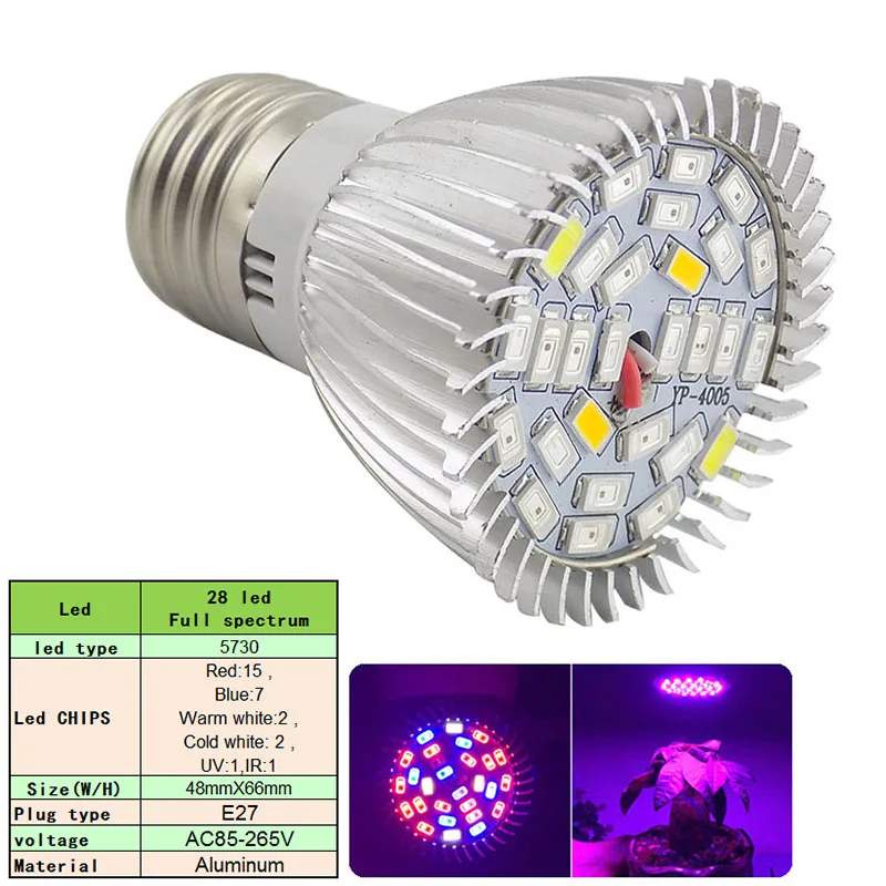 Напряжение: 85-265 В переменного токаОснование: E27LED Длина волны: Красный 660nm, синий 445nmТип светодиодный: SMD5730Угол луча: 180 градусовДиаметр: 48 ммДлина: 66 мм (E27)18 светодиодный светящийся свет полный спектр Спецификация:Напряжение: 85-265 В переменного токаОснование: E27Светодиодный Длина волны: Красный 660нм, синий 445нмСветодиодный Тип: SMD 5730Мощность: 8 ВтУгол луча: 180 градусовДлина: 66 мм (E27)Диаметр: 48 ммКоличество СВЕТОДИОДНЫЙ: 11 красный + 4 синий + 1 ИК + 1 теплый светильник + 1 белый светильник28 светодиодный светильник полного спектра Спецификация:Количество СВЕТОДИОДНЫЙ: 16 Красный, 8 синий, 2 теплый белый, 2 холодный белыйНапряжение: 85-265 В переменного токаОснование: E27Светодиодный Длина волны: Красный 660нм, синий 445нмТип светодиодный: SMD5730Мощность: 10 ВтУгол луча: 180 градусовДиаметр: 48 ммДлина: 66 мм (E27)Особенности зажима:1 шт. • золотистый шарик в форме цифры «/2/3 головы x E27 основание светильника гнездо адаптера зажимы-преобразователи на выбор• Переключатель: 1 ВКЛ./ВЫКЛ.• Штепсельная вилка стандарта США/ЕС может быть непосредственно подключена или заменена на светильник• Переключатель вкл./выкл.• Регулируемый держатель лампы на 360 градусов, вы можете изменить угол освещения лампы и увеличить по вашему желанию.• Светильник вес, просты в установке• Подходит для светодиодный/CFL светильник лампы, которая должна быть не более 70 Вт•Тип вилки: США/ЕС• Номинальный ток: 6А• Мощность: 100-240 В• Цвет: белый• Материал: Премиум-металл и пластик, изготовлен из прочного и практичного металла и пластика• Длина кабеля: прибл. 30 см каждая горловина.• Длина кабеля питания около 160 см