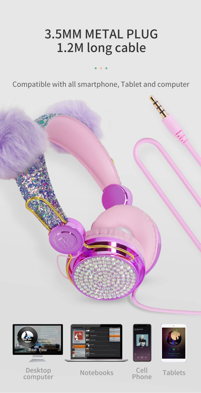 Детские наушники отделаны двумя плюшевыми ушками, наушники инкрустированы стразами