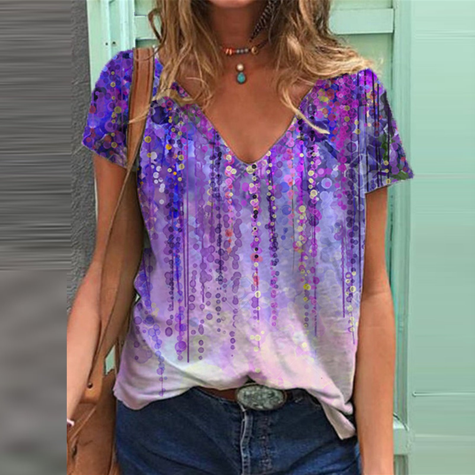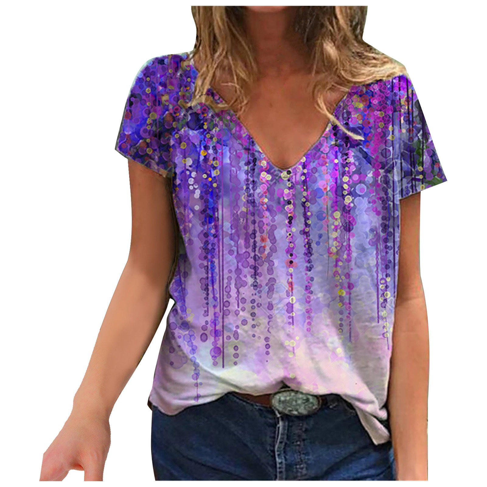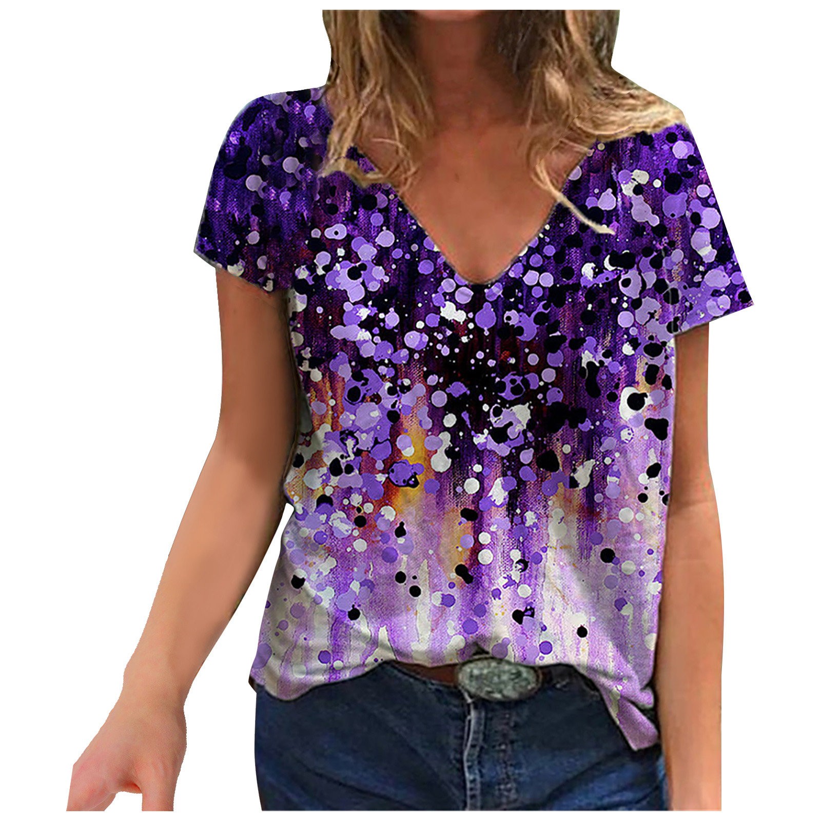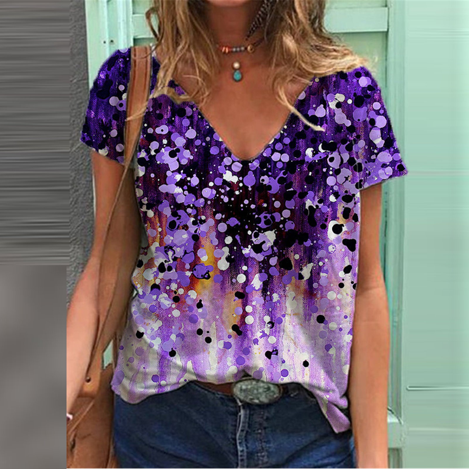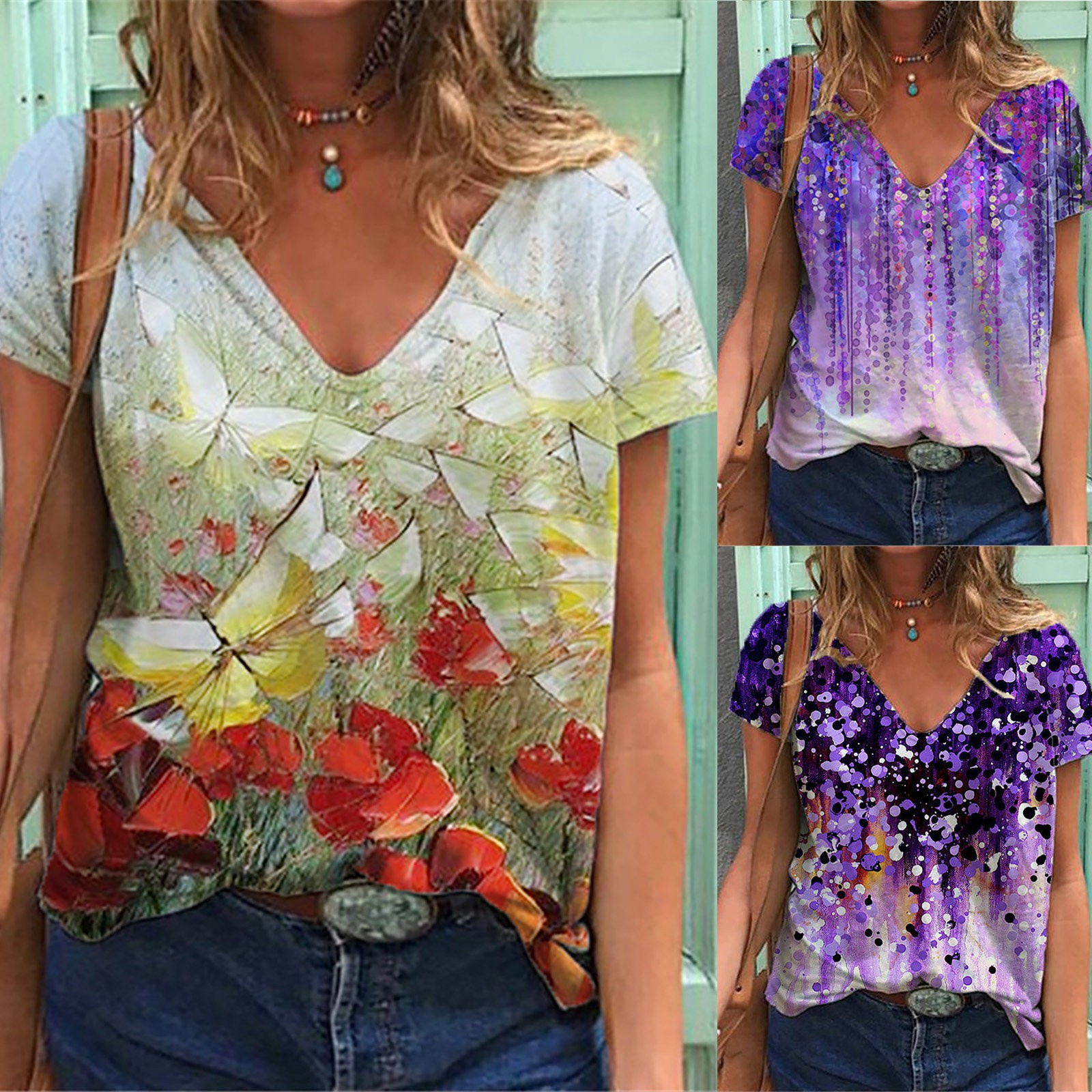 Женские повседневные Модные свободные ослепительные топы с v-образным вырезом и принтом с короткими рукавами