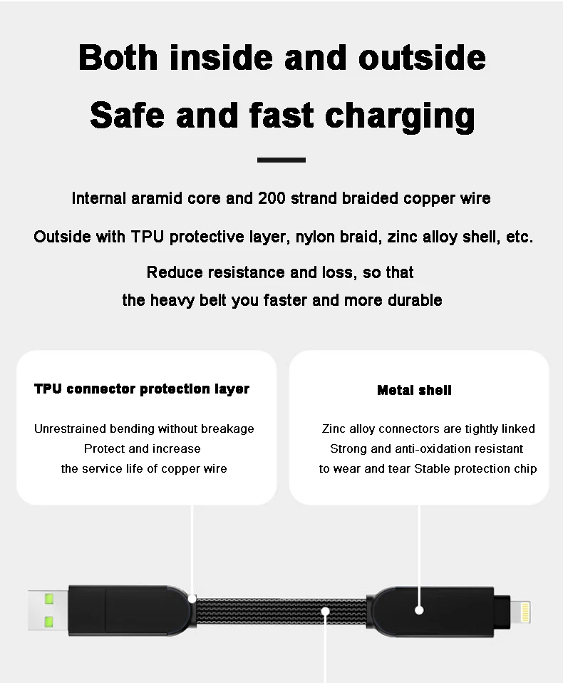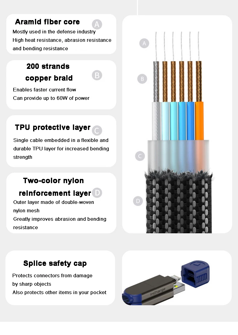 Снаружи защитный слой из ТПУ, нейлоновая оплетка, корпус из цинкового сплава и т. д.