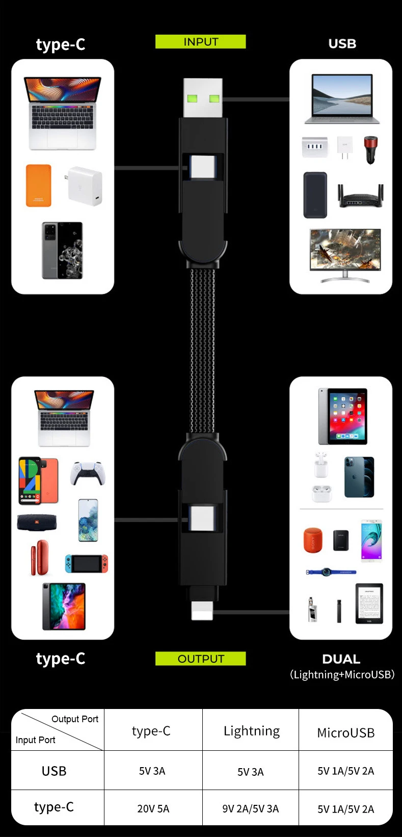 1. Этот Кабельный соединитель PD 100W имеет четыре различных типа кабельных входов/выходов, предлагая все возможности подключения, которые вам когда-либо понадобятся.
