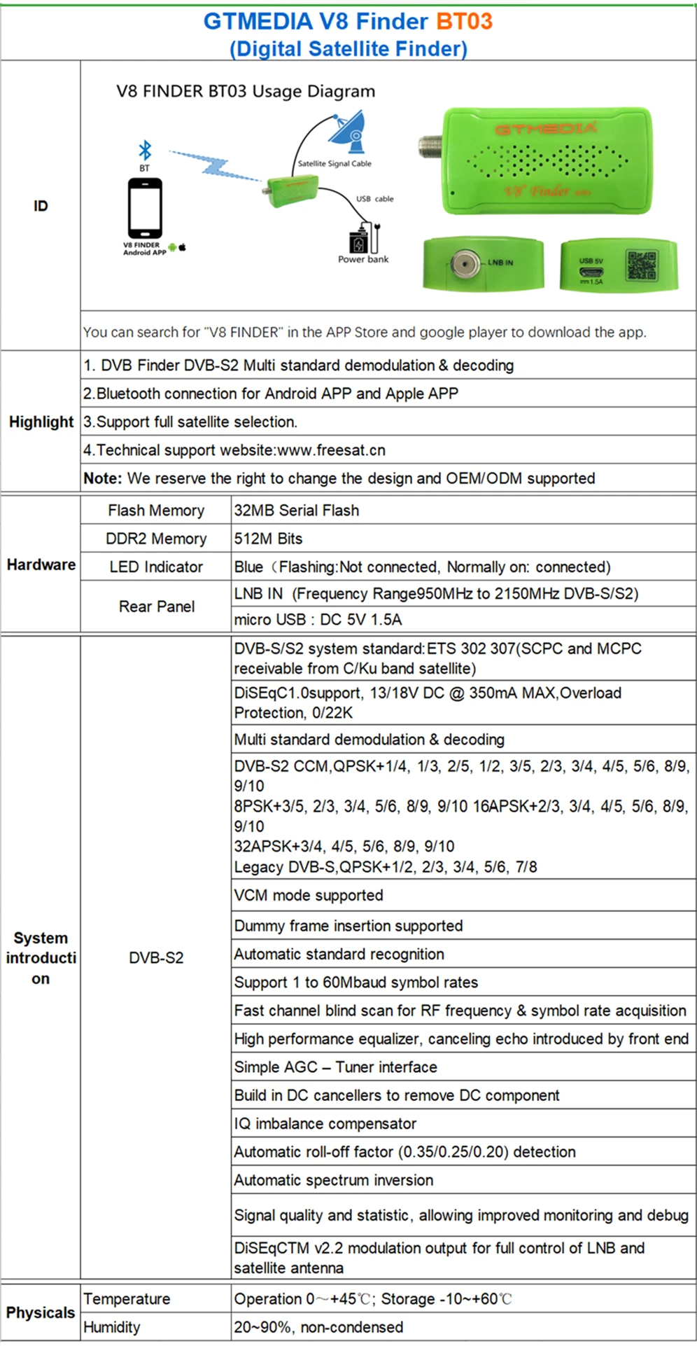 Основные характеристики 1. Устройство поиска DVB DVB-S2 мульти-стандартной демодуляции и декодирования 2. Поддержка полного выбора спутника. Посылка в комплекте 1 * устройство поиска DVB BOX 1 * цифровой спутниковый искатель BT03 1 * Мини USB кабель 1 * Руководство пользователя
