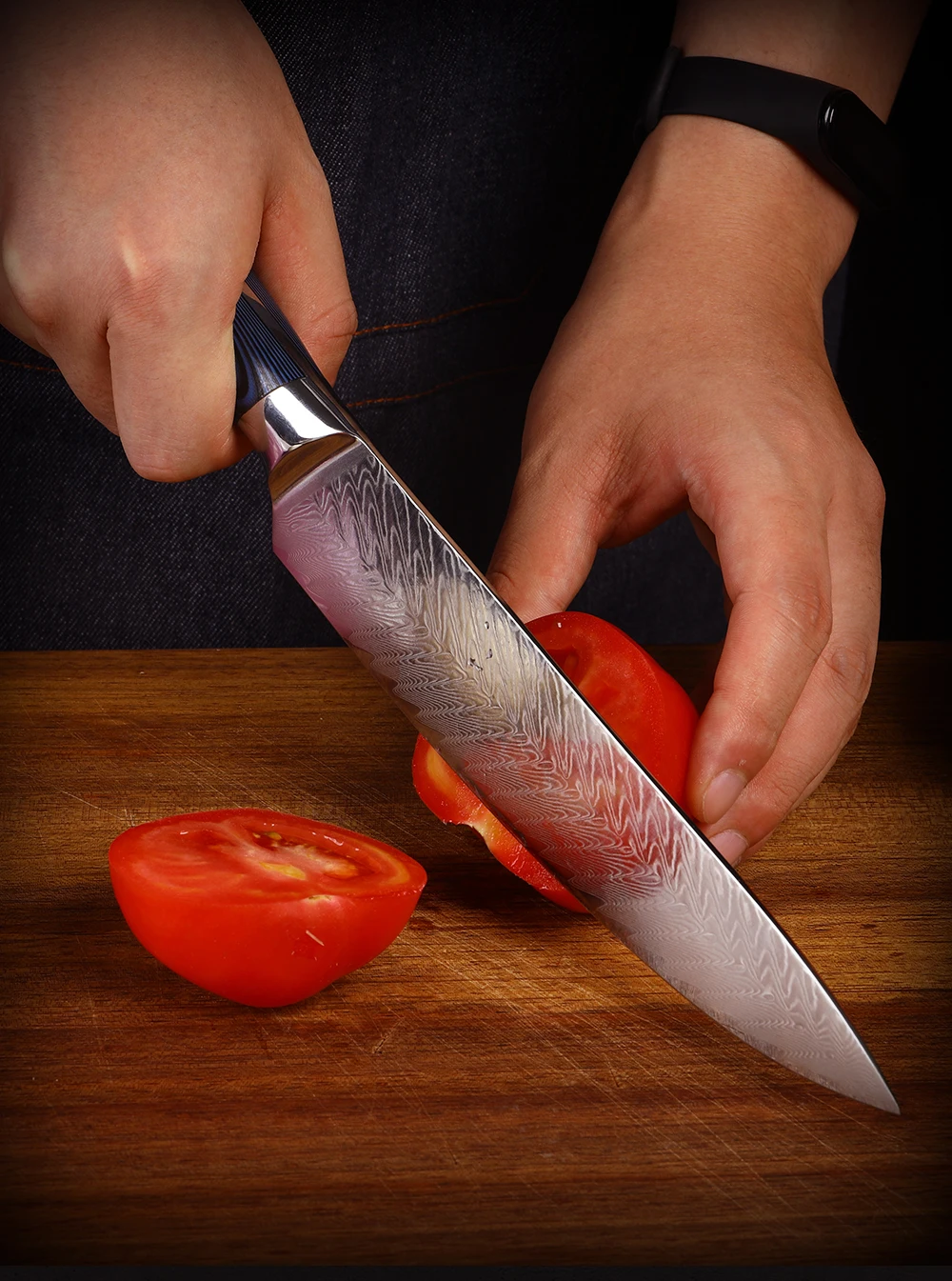 WAK Professional 9Cr18MoV Damascus Kitchen Chef Knife V Shaped Pattern Blade Knives Blue and Black G10 Soft Handle Knife