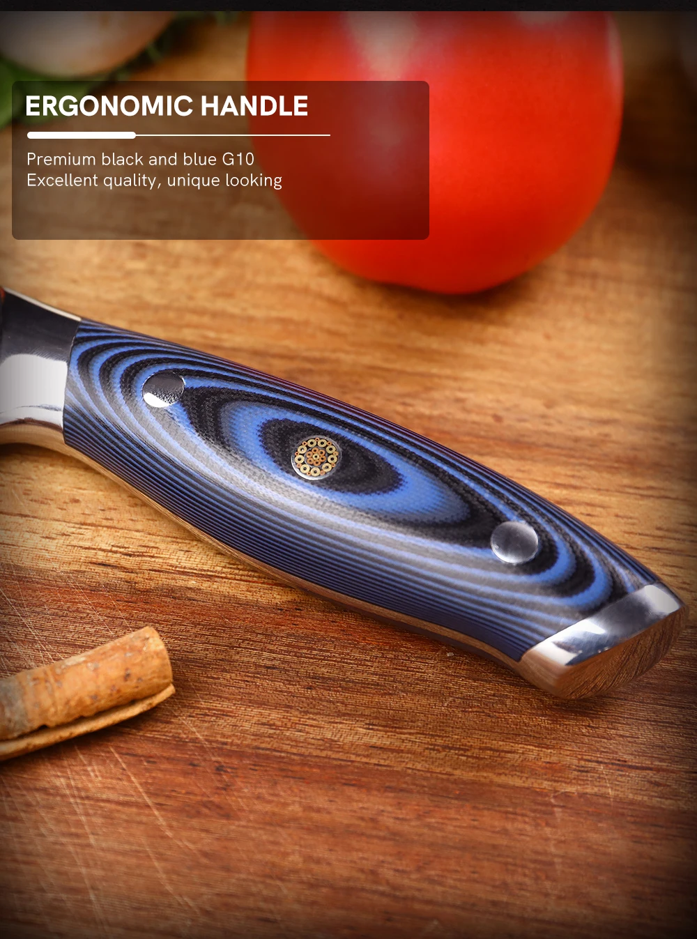 The handle material is G10, high quality and durable. Good and sharp knife that will free your kitchen from the blunt knife! Start enjoying cooking again!