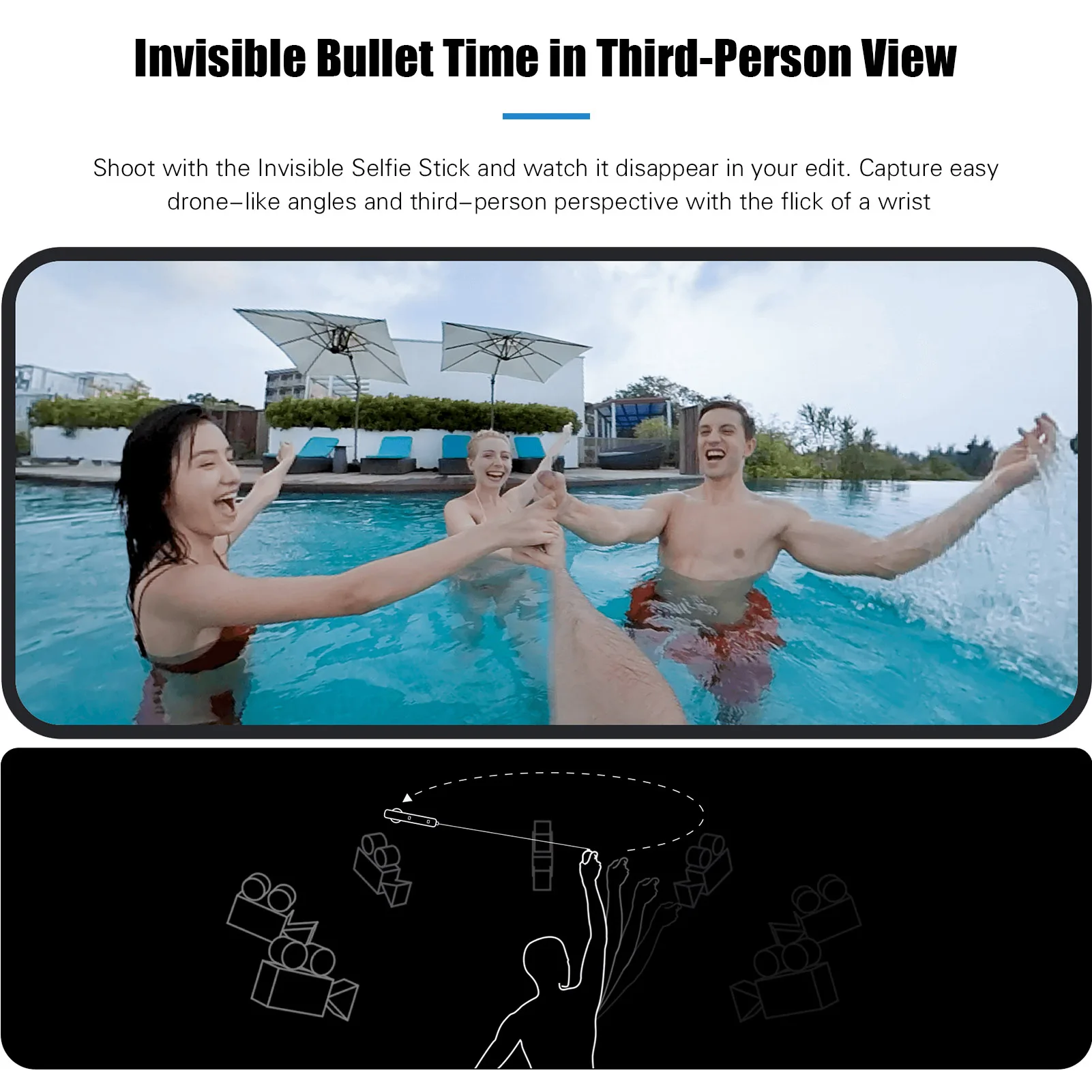 Время невидимой пули:С невидимой селфи-палкой (не входит в комплект) для полной записи видео на 360 °, подключите селфи-палку с помощью ручки Insta360 bullet time (не входит в комплект), чтобы изучить изображение третьего лица.