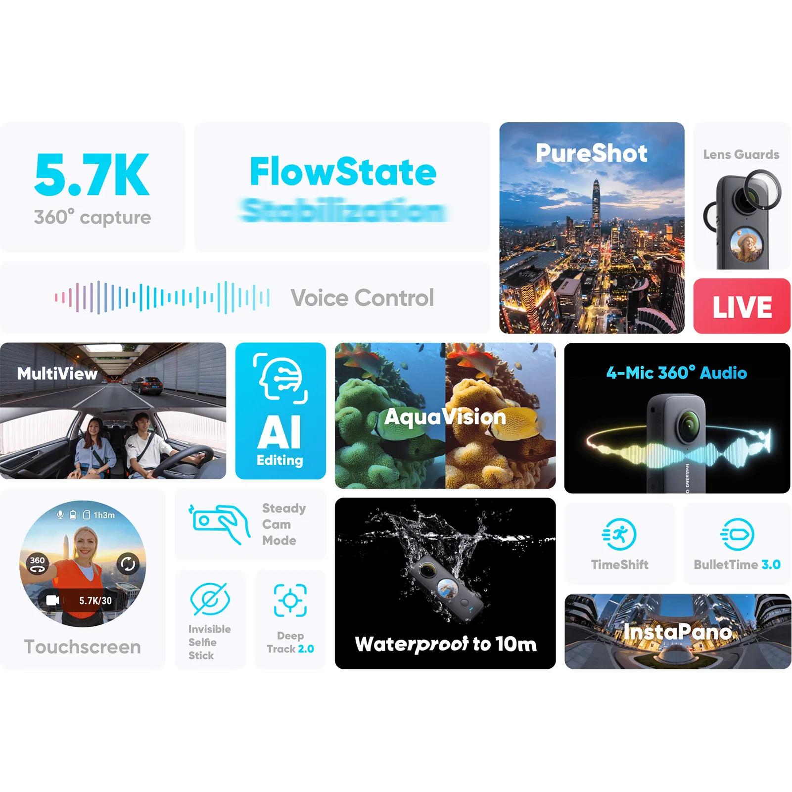 5,7 K 30 кадров в секунду видео и фото:360 ° панорамный и широкоугольный 5,7 K @ 30fps видео и 6080x3040 фото доступны, с сенсорной круглый ЖК-дисплей экран для просмотра и легкая работа.