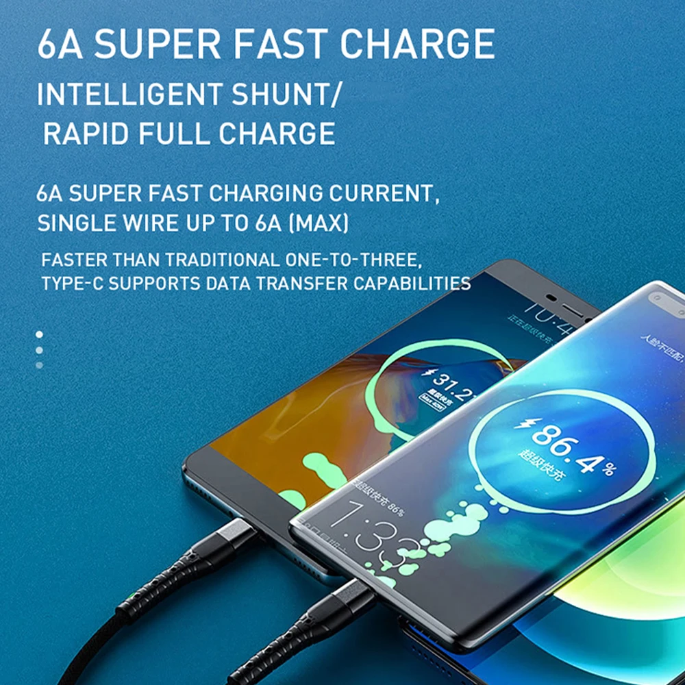 6A super fast charging large current, single line can reach 6A (Max) faster than the traditional one drag three, Type-C support data transmission function