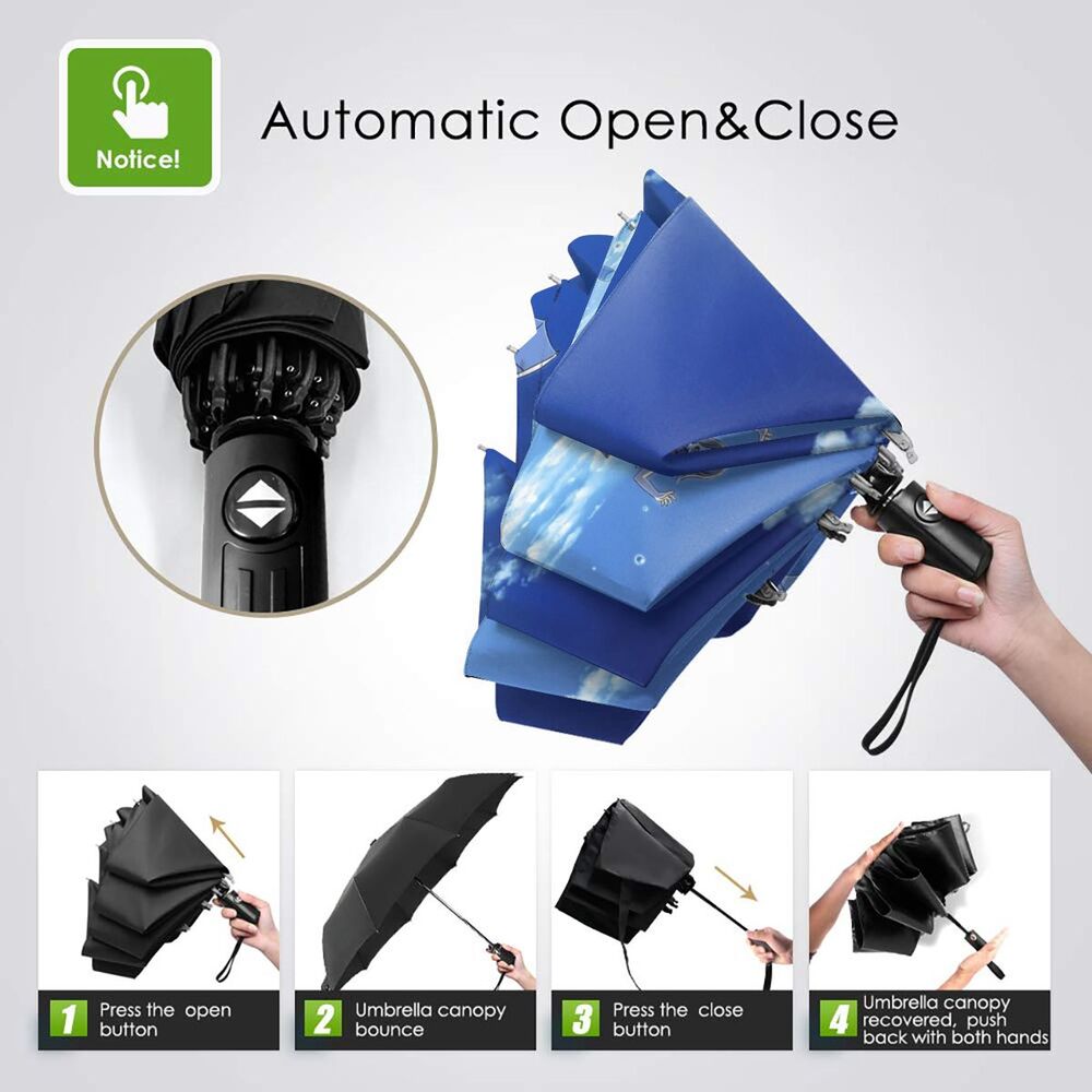 3. Откройте и закройте за считанные секунды: одним нажатием кнопки Зонт автоматически открывается и закрывается. Отлично подходит для быстрого входа в автомобиль, здание или палатку. Простой и простой в использовании всего 1 рукой.