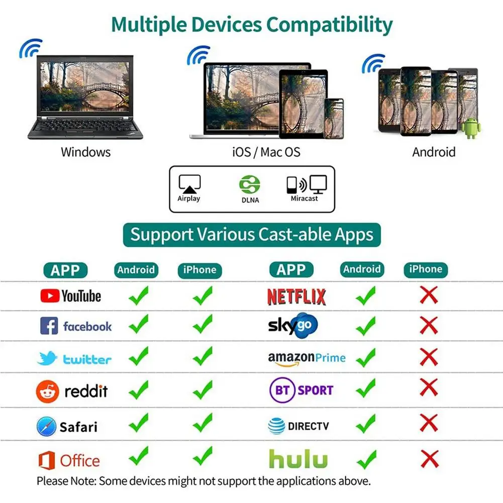 LU, для Vudu, для Movistar и т. д. наш беспроводной HDMI ключ не может передавать изображения на телевизор, потому что эти приложения имеют защиту авторских прав на видео HDCP.