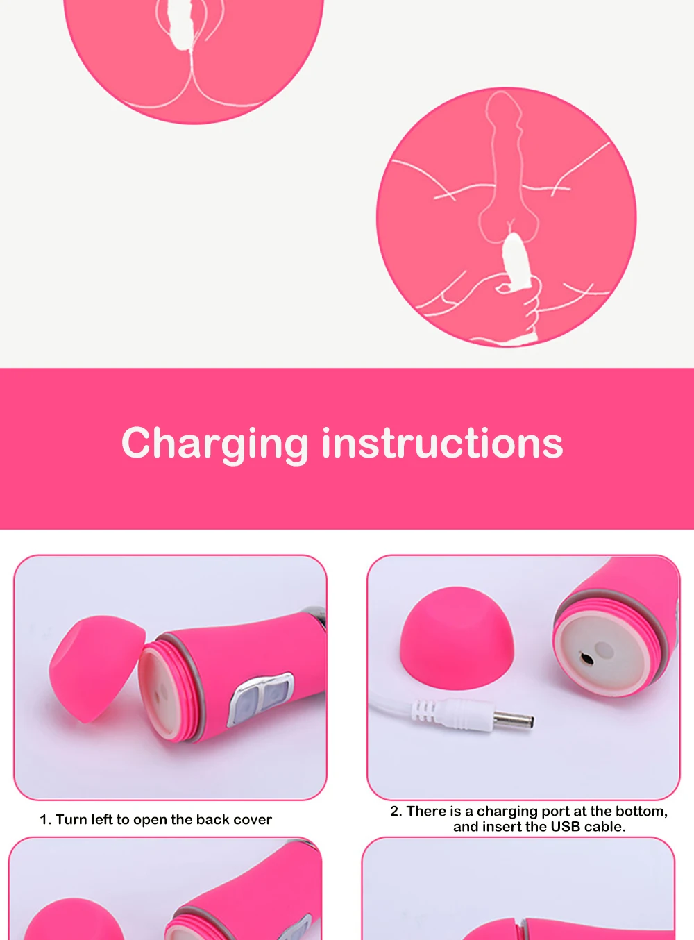 1. Поверните налево, чтобы открыть заднюю крышку 2. Внизу имеется зарядный порт и вставьте USB-кабель. 3. Подключите USB мобильный телефон Зарядный порт или USB-порт для компьютера, Красный светодиодный мигает во время зарядки. 4. Красный светодиодный ОД горит всегда, указывая на завершение зарядки, поверните его вправо, чтобы выключить Батарейного отсека достаточно. Функция: Вибрация Источник питания: встроенная литиевая Электроника Цвет: фиолетовый/розово-красный