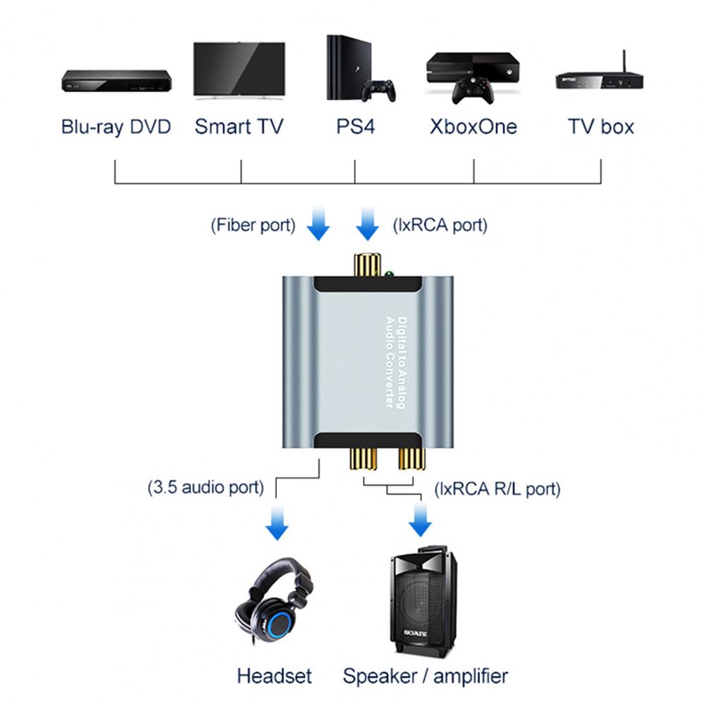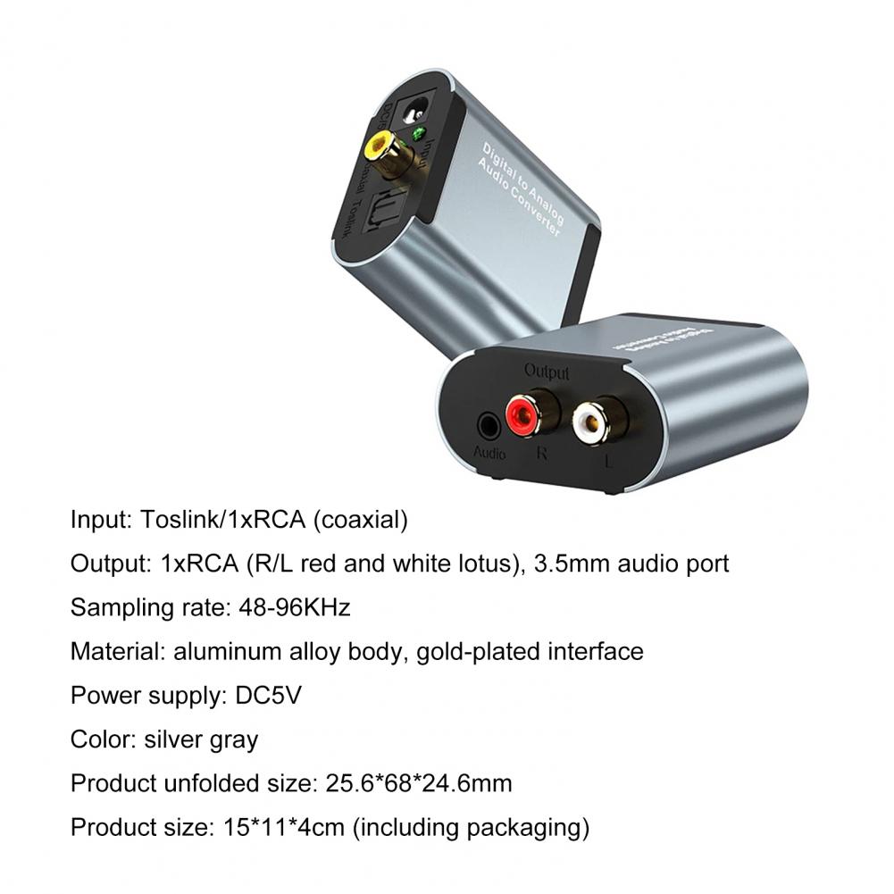 Он преобразует коаксиальные или Toslink цифровые аудиосигналы в аналоговые аудио L/R. И обеспечивает электромагнитную бесшумную передачу.