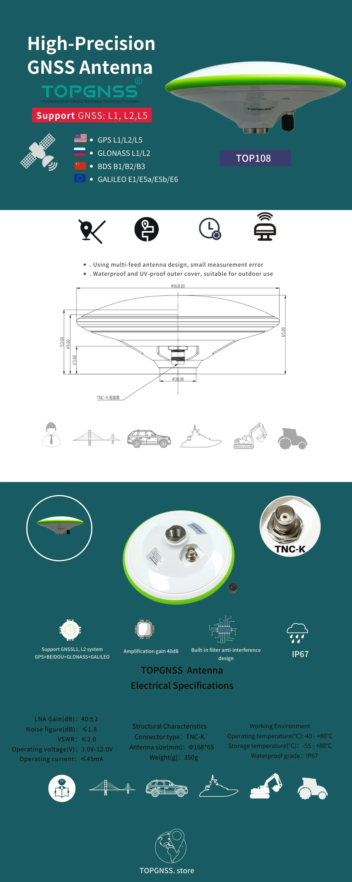 Беспроводное решение TOPGNSS GNSS обеспечиваетGNSS антенна серии продукты обеспечивают ODMTognss GNSS антенны больше новых спецификаций на выбор, может обеспечить OEM / ODM услуги.Если у вас есть особые потребности, пожалуйста, свяжитесь с нами, мы предоставим вам профессиональные навыки и услуги!