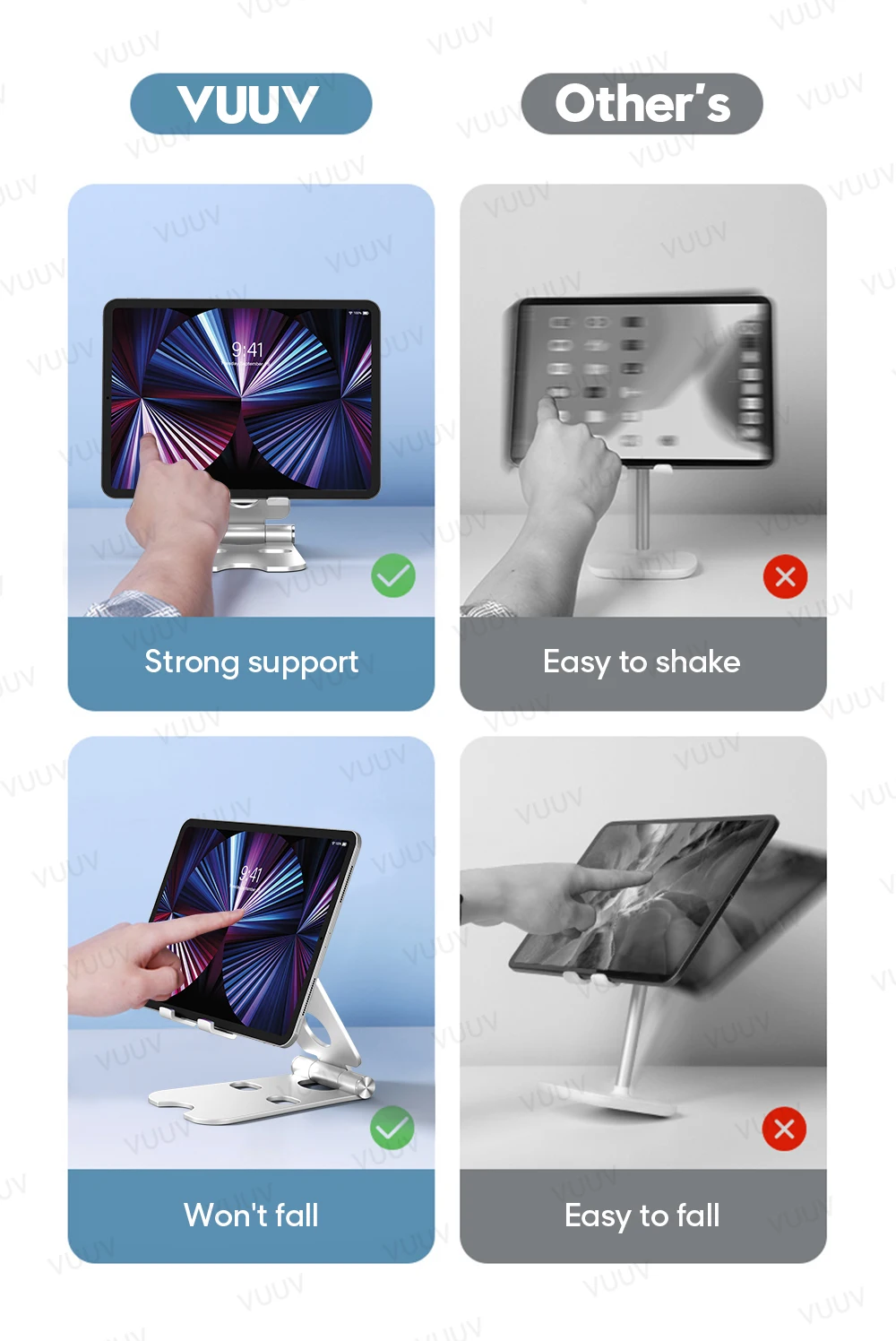 Made of all metal, it is heavier than other tablet stand,stands on a flat surface more stably, and is not easy to shake.